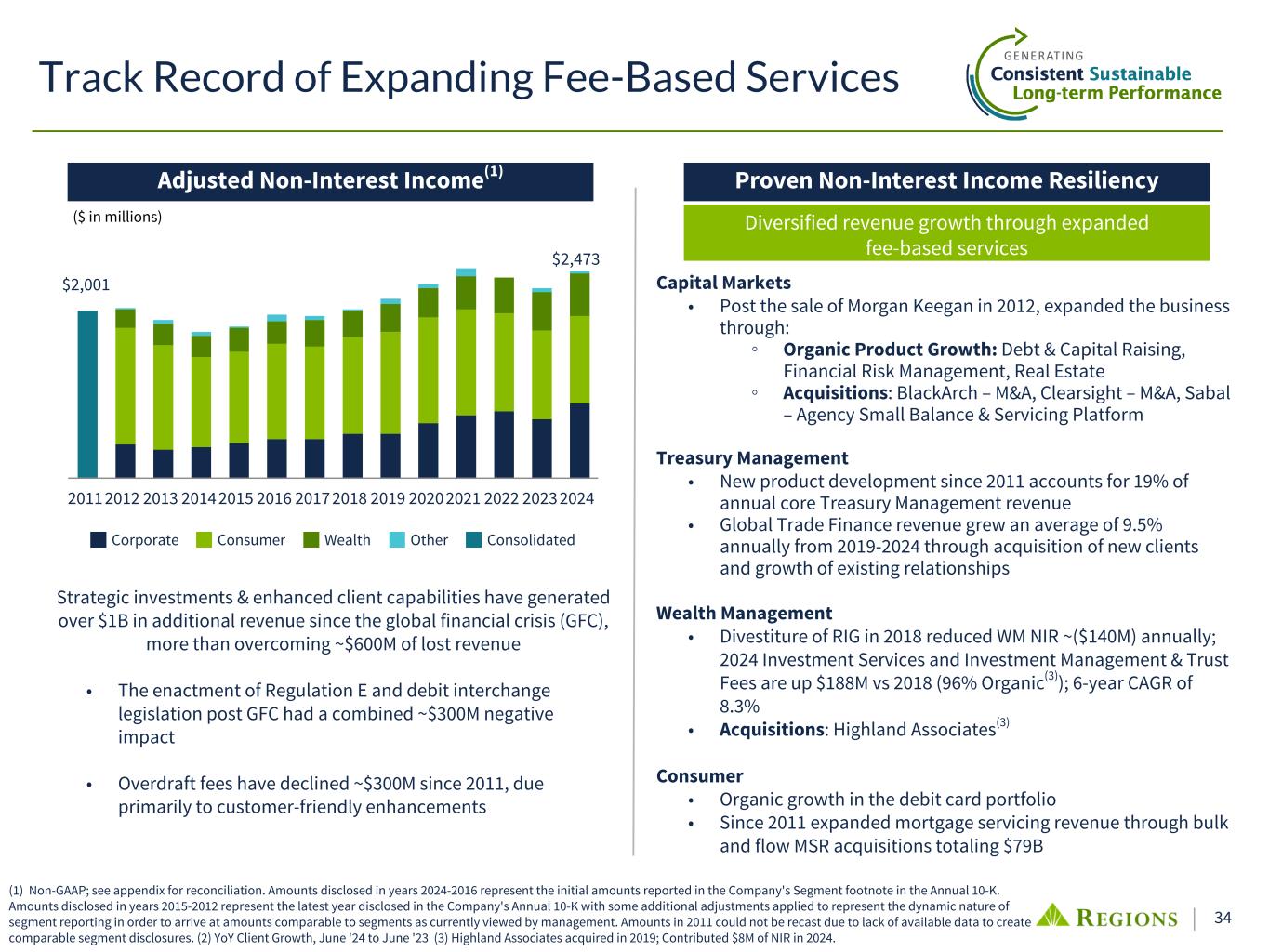 34 Track Record of Expanding Fee-Based Services Proven Non-Interest Income ResiliencyAdjusted Non-Interest Income(1) Diversified revenue growth through expanded fee-based services (1) Non-GAAP; see appendix for reconciliation. Amounts disclosed in years 2024-2016 represent the initial amounts reported in the Company's Segment footnote in the Annual 10-K. Amounts disclosed in years 2015-2012 represent the latest year disclosed in the Company's Annual 10-K with some additional adjustments applied to represent the dynamic nature of segment reporting in order to arrive at amounts comparable to segments as currently viewed by management. Amounts in 2011 could not be recast due to lack of available data to create comparable segment disclosures. (2) YoY Client Growth, June '24 to June '23 (3) Highland Associates acquired in 2019; Contributed $8M of NIR in 2024. ($ in millions) Capital Markets • Post the sale of Morgan Keegan in 2012, expanded the business through: ◦ Organic Product Growth: Debt & Capital Raising, Financial Risk Management, Real Estate ◦ Acquisitions: BlackArch – M&A, Clearsight – M&A, Sabal – Agency Small Balance & Servicing Platform Treasury Management • New product development since 2011 accounts for 19% of annual core Treasury Management revenue • Global Trade Finance revenue grew an average of 9.5% annually from 2019-2024 through acquisition of new clients and growth of existing relationships Wealth Management • Divestiture of RIG in 2018 reduced WM NIR ~($140M) annually; 2024 Investment Services and Investment Management & Trust Fees are up $188M vs 2018 (96% Organic(3)); 6-year CAGR of 8.3% • Acquisitions: Highland Associates(3) Consumer • Organic growth in the debit card portfolio • Since 2011 expanded mortgage servicing revenue through bulk and flow MSR acquisitions totaling $79B Strategic investments & enhanced client capabilities have generated over $1B in additional revenue since the global financial crisis (GFC), more than overcoming ~$600M of lost revenue • The enactment of Regulation E and debit interchange legislation post GFC had a combined ~$300M negative impact • Overdraft fees have declined ~$300M since 2011, due primarily to customer-friendly enhancements Corporate Consumer Wealth Other Consolidated 2011 2012 2013 2014 2015 2016 2017 2018 2019 2020 2021 2022 2023 2024 $2,001 $2,473