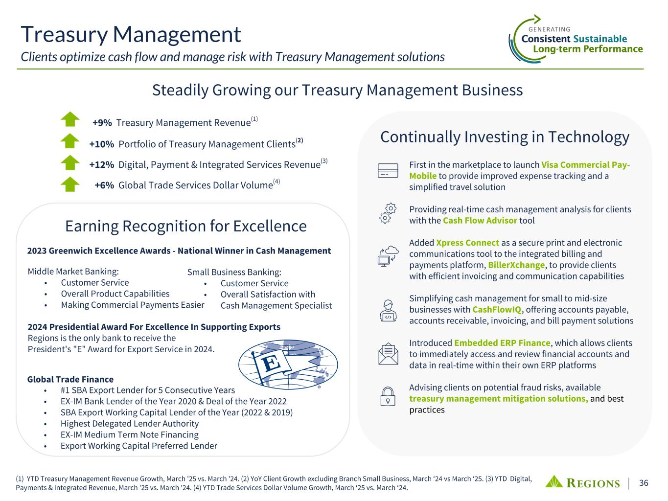36 +9% Treasury Management Revenue(1) +10% Portfolio of Treasury Management Clients(2) +12% Digital, Payment & Integrated Services Revenue(3) +6% Global Trade Services Dollar Volume(4) Continually Investing in Technology First in the marketplace to launch Visa Commercial Pay- Mobile to provide improved expense tracking and a simplified travel solution Providing real-time cash management analysis for clients with the Cash Flow Advisor tool Added Xpress Connect as a secure print and electronic communications tool to the integrated billing and payments platform, BillerXchange, to provide clients with efficient invoicing and communication capabilities Simplifying cash management for small to mid-size businesses with CashFlowIQ, offering accounts payable, accounts receivable, invoicing, and bill payment solutions Introduced Embedded ERP Finance, which allows clients to immediately access and review financial accounts and data in real-time within their own ERP platforms Advising clients on potential fraud risks, available treasury management mitigation solutions, and best practices Treasury Management Clients optimize cash flow and manage risk with Treasury Management solutions Global Trade Finance • #1 SBA Export Lender for 5 Consecutive Years • EX-IM Bank Lender of the Year 2020 & Deal of the Year 2022 • SBA Export Working Capital Lender of the Year (2022 & 2019) • Highest Delegated Lender Authority • EX-IM Medium Term Note Financing • Export Working Capital Preferred Lender 2023 Greenwich Excellence Awards - National Winner in Cash Management (1) YTD Treasury Management Revenue Growth, March '25 vs. March '24. (2) YoY Client Growth excluding Branch Small Business, March ‘24 vs March ‘25. (3) YTD Digital, Payments & Integrated Revenue, March '25 vs. March '24. (4) YTD Trade Services Dollar Volume Growth, March ‘25 vs. March ‘24. Small Business Banking: • Customer Service • Overall Satisfaction with Cash Management Specialist Middle Market Banking: • Customer Service • Overall Product Capabilities • Making Commercial Payments Easier Earning Recognition for Excellence Steadily Growing our Treasury Management Business 2024 Presidential Award For Excellence In Supporting Exports Regions is the only bank to receive the President's "E" Award for Export Service in 2024.