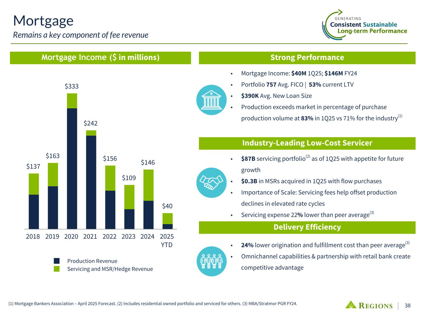 37 Growing our Wealth Management Business(2) +1% Total Client Assets(3) +8% Total WM Relationships(4) +10% WM NIR(1) Wealth Management NIR(1) ($ in millions) The Value We Bring To Our Clients The Client Experience Every client is unique and deserves a tailor-made path to confidently reach their evolving financial goals. Wherever you are, and wherever you are going, we offer a dedicated team, specialized expertise, and investment guidance to help you manage and grow wealth. • Managing Wealth for Individuals and Institutions • Advice & Guidance / Planning / Consultative Approach • Solutions: Wealth Planning, Retirement Planning, Trust & Estates, Digital Investing, Natural Resources & Real Estate, Philanthropic Solutions, Investment Management, Funeral Trust, Custody, Escrows, Corporate Trusts, Business Succession, Brokerage and Life Insurance $306 $322 $337 $382 $419 $451 $495 $235 $243 $253 $278 $297 $313 $338 $71 $79 $84 $104 $122 $138 $157 Investment Management & Trust Fees Investment Services Fee Income 2018 2019 2020 2021 2022 2023 2024 The Voice of the Regions Wealth Client • Continued Strength. Private Wealth Voice of the Client metrics remain strong: ratings on all key loyalty metrics rose compared to prior year. These results are driven by an increase in 5-star scores from clients who are fully satisfied with their advisor team and experience. ◦ The primary indicator of client satisfaction is the Private Wealth Management Index or PWMI. For 2024, the PWMI rose by 3.7 points and stands at 83.2% - up from 79.5% last year. • Impact of the Relationship Team. Clients are very satisfied with their team – 93% of clients gave their primary point of contact a 5-star rating. The majority of clients identified their Wealth Advisor as their primary point of contact, which aligns with our desired delivery model. • Impact of Wealth Planning. Wealth Planning remains a differentiator in client engagement and satisfaction – 72% of clients say they have had a Wealth Plan discussion. Wealth Planning unlocks deeper engagement and satisfaction– clients with a Wealth Plan score significantly higher across all key metrics evaluated. • Focus on Action. Launched a new Voice of the Client Insights Dashboard to empower leaders and advisors with actionable client feedback. (1) WM NIR does not include the top of company portion of service charges on deposit accounts and similar smaller dollar amounts that are also attributable to WM. 2024 vs 2023 (2) YoY comparisons as of 03/31/25 unless otherwise noted. (3) Client Assets consists of AUA, Brokerage Assets and Annuity Assets. (4) Total WM Relationships consists of Total Private Wealth Households, Institutional Accounts, and Investment Services Accounts. Wealth Management Specialized expertise and tailored investment guidance to manage and grow wealth 8.3% CAGR