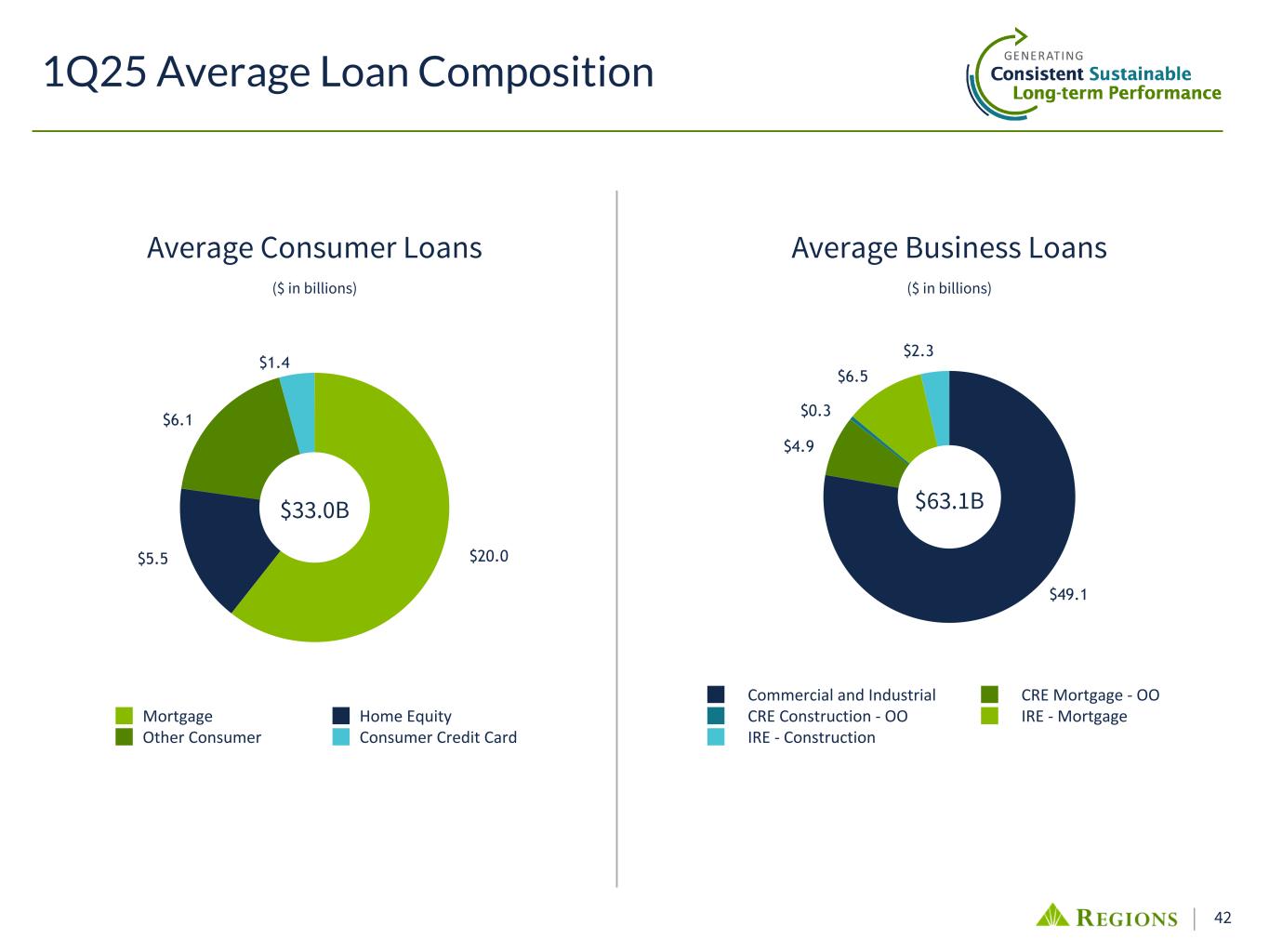 41 QoQ Highlights & Outlook • Avg loans remained relatively stable while ending loans declined 1% • Avg business loans remained stable; Customers carrying more liquidity & utilization rates remain below historic levels • Pipelines and commitments continue to trend higher, with clients ready for expansion, though it's too early to assess the full impact of tariffs on loan demand • Avg consumer loans decreased ~1% led by seasonal declines in HIFi (Home Improvement Financing) and mortgage • Expect FY 2025 average loan balances to be relatively stable, compared to 2024 $96.9 $96.7 $95.7 $63.6 $63.5 $62.9 $33.3 $33.2 $32.8 1Q24 4Q24 1Q25 $97.4 $96.4 $96.1 $64.0 $63.2 $63.1 $33.4 $33.2 $33.0 1Q24 4Q24 1Q25 Average Loans & Leases ($ in billions) Business LoansConsumer Loans Ending Loans & Leases ($ in billions) Loans Stable loan trends with cautious optimism for growth