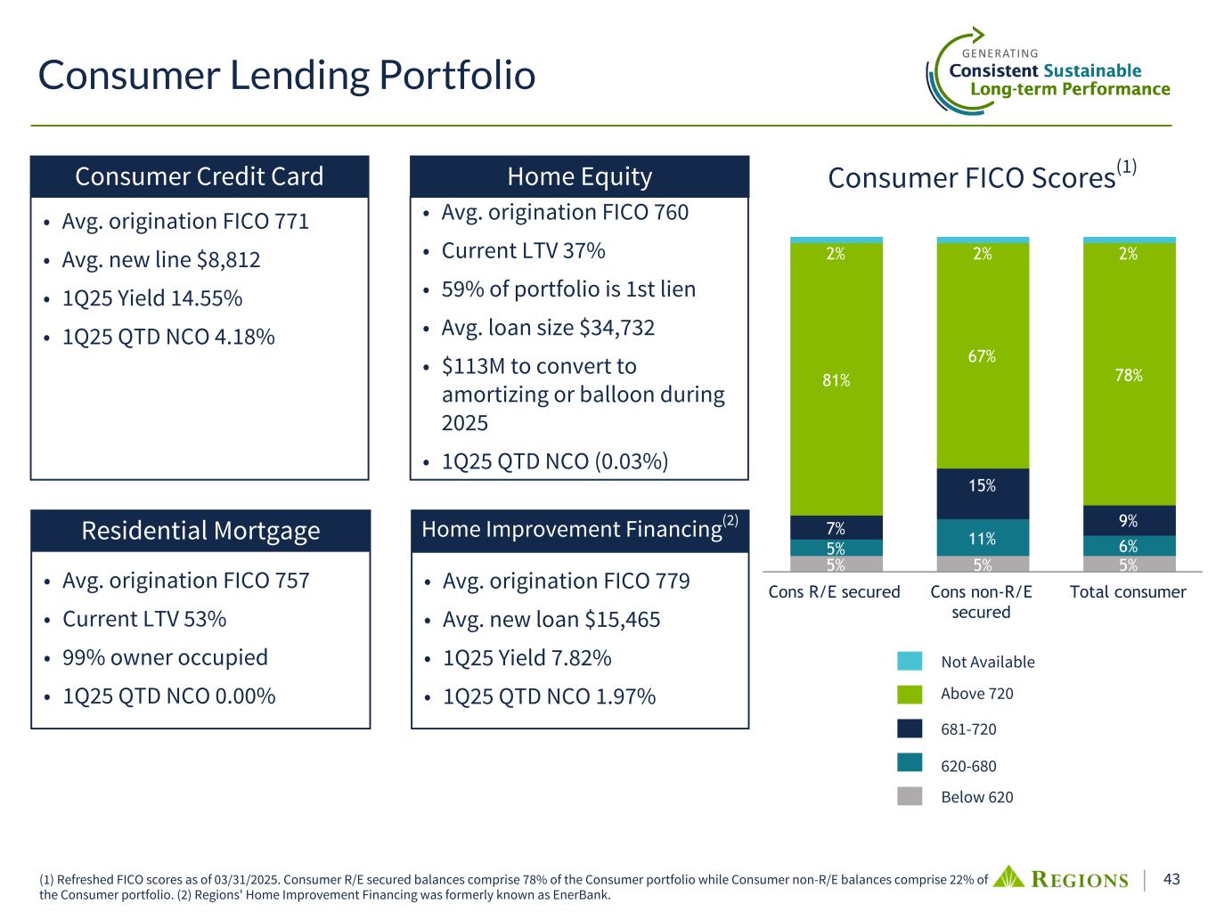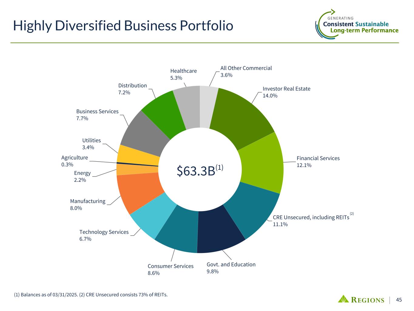 44 Ascentium & Home Improvement Financing (1) Key portfolio metrics were provided with the company's original acquisition announcement on Form 8-K dated February 27, 2020. (2) Regions' Home Improvement Financing previously known as EnerBank. Key portfolio metrics were provided with the company's original acquisition announcement on Form 8-K dated June 8, 2021.. (3) Represents ending loan balance from June 2020 to March 2025. 1Q25 Ascentium Capital Home Improvement Financing 1Q Average Balances $2.6B $5.1B 1Q Portfolio Yield 8.4% 7.8% 1Q Going-on Yield 10.0% 9.6% 1Q NCOs 2.25% 1.97% Ascentium Capital(1) Origination Growth • Since acquisition, Ascentium Capital has grown by 40%(3) • 56% of branches are actively offering Ascentium solutions • In-footprint opportunities exist with the over 400k Small Business customers currently banked within the Consumer Branch network • Contributing to strategic growth are transactions originated through cross-marketing relationships with Commercial Banking, Small Business Banking, and Home Improvement Finance Credit • Instilled risk based pricing • NCOs have reverted to pre-pandemic levels and delinquencies have been range bound Production • 1Q25 up 12% from the prior year quarter Home Improvement Financing(2) Credit • Prime/Super-prime focus has resulted in a strong portfolio credit profile; average FICO of 753 Growth Opportunities • Continue to focus efforts on leveraging relationships across the organization to drive growth opportunities through referrals and enhanced value proposition. Strong Pipeline • Strong existing relationships provide a base of consistency while continuing to focus on adding high quality independent contractors and program sponsors Production • 1Q25 loan production was challenged by economic conditions and competitive pressures. Economic uncertainty remains a headwind for growth, but prudent risk management and pricing discipline ensures that loan origination is resulting in high-quality, profitable loans.