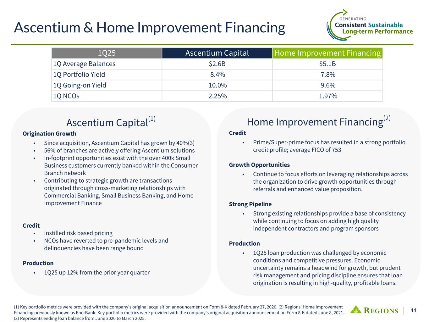 43 Consumer Lending Portfolio • Avg. origination FICO 757 • Current LTV 53% • 99% owner occupied • 1Q25 QTD NCO 0.00% • Avg. origination FICO 760 • Current LTV 37% • 59% of portfolio is 1st lien • Avg. loan size $34,732 • $113M to convert to amortizing or balloon during 2025 • 1Q25 QTD NCO (0.03%) • Avg. origination FICO 779 • Avg. new loan $15,465 • 1Q25 Yield 7.82% • 1Q25 QTD NCO 1.97% • • Avg. origination FICO 771 • Avg. new line $8,812 • 1Q25 Yield 14.55% • 1Q25 QTD NCO 4.18% 5% 5% 5% 5% 11% 6% 7% 15% 9% 81% 67% 78% 2% 2% 2% Cons R/E secured Cons non-R/E secured Total consumer Not Available Above 720 620-680 Below 620 681-720 Consumer FICO Scores(1) (1) Refreshed FICO scores as of 03/31/2025. Consumer R/E secured balances comprise 78% of the Consumer portfolio while Consumer non-R/E balances comprise 22% of the Consumer portfolio. (2) Regions' Home Improvement Financing was formerly known as EnerBank. Residential Mortgage Consumer Credit Card Home Equity Home Improvement Financing(2)