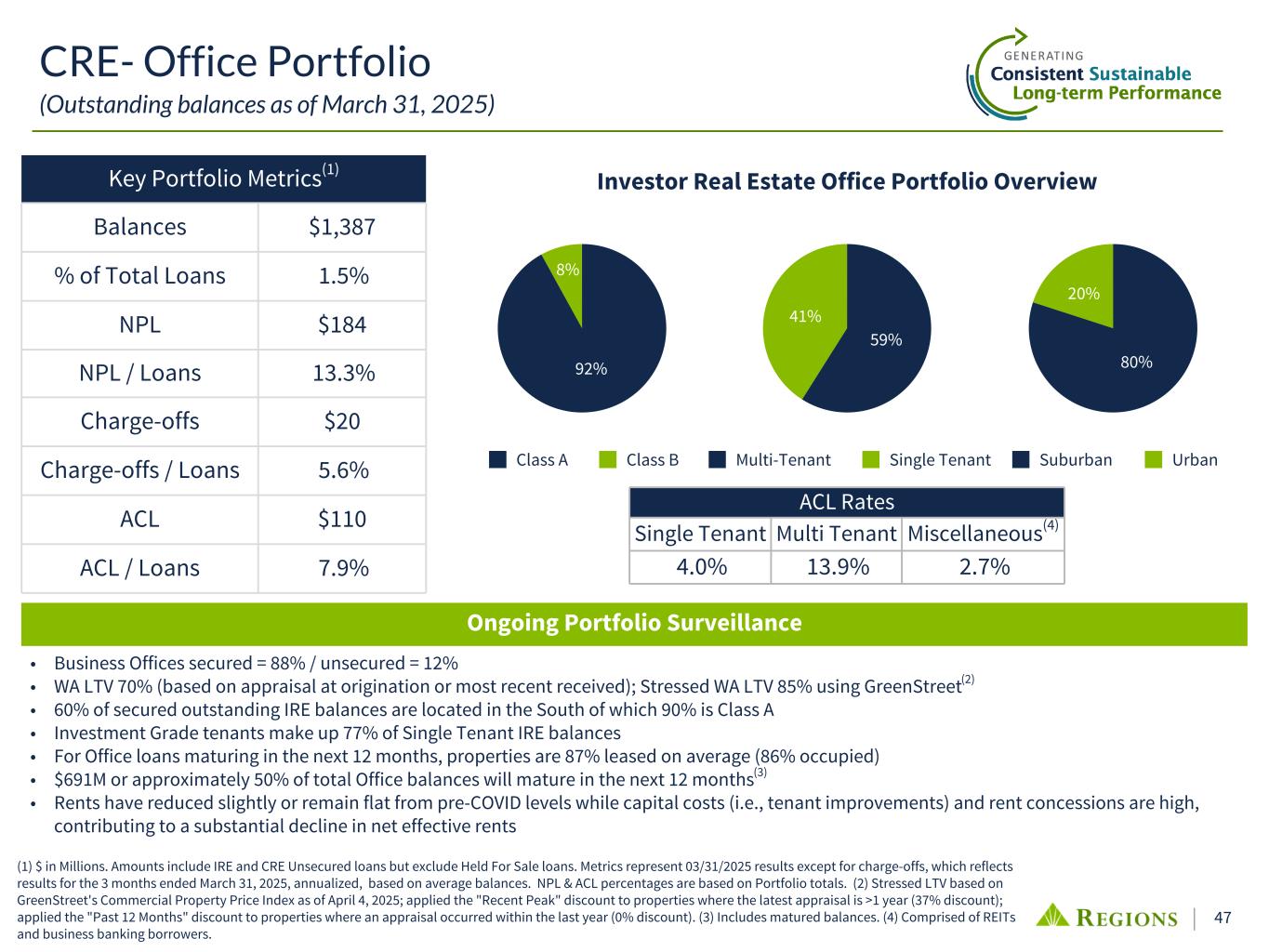 46 Commercial Real Estate (Outstanding balances as of March 31, 2025) Highly Diversified Portfolio (IRE including Unsecured CRE) (1) Excludes $5.2B of Owner-occupied CRE whose source of repayment are individual businesses, and whose credit performance resembles Commercial during periods of stress. (2) Based off 12/31/2024 Risk Based Capital estimate. Supervisory limits in the December 2006 joint regulatory issuance "Guidance on Concentrations in Commercial Real Estate Lending, Sound Risk Management Practices". Res. Homebuilders 8.5% Other 3.1% Hotel 4.9% Healthcare 7.8% Retail 8.9% Residential Land 0.4% Office 8.8% Data Center 1.0% Diversified 10.9%Industrial 14.9% Commercial Land 0.3% Self Storage 2.0% Apartments 28.5% $15.8B $ in billions % of Total Loans Unsecured CRE (incl. REITS) $ 7.0 7.3 % IRE 8.8 9.2 % Total(1) $ 15.8 16.5 % Yearly Loan Maturities 3% 22% 31% 26% 11% 5% 2% Multi-Family Office Other Real Estate Total Real Estate Matured 2025 2026 2027 2028 2029 >5years $— $1,000 $2,000 $3,000 Office 4% Data Center 3% Diversified 16% Apartments 5% Hotel 12% Industrial 26% Other 6% Self Storage 6% Retail 22% REITs within Total: $5.2B • Unsecured loans for RE purposes generally have low leverage, with strong access to liquidity ◦ 65% of REIT outstanding balances are investment grade or mapped to an IG risk rating, which provides loss insulation to the overall portfolio ◦ Balance of remaining unsecured is primarily to institutional RE Funds backed by predominantly IG sponsors • Total IRE (incl unsec. CRE) to Risk Based Capital(2): 107% and Construction, Land, and Acq. & Dev. to Risk Based Capital: 19% are well below supervisory limits (300%/100%) Key Portfolio Metrics