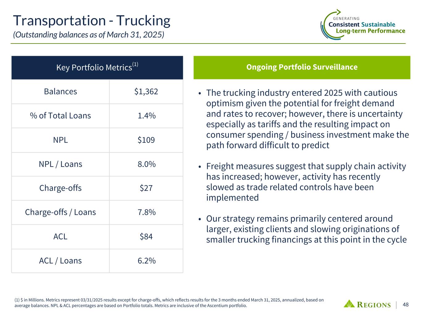 48 Transportation - Trucking (Outstanding balances as of March 31, 2025) (1) $ in Millions. Metrics represent 03/31/2025 results except for charge-offs, which reflects results for the 3 months ended March 31, 2025, annualized, based on average balances. NPL & ACL percentages are based on Portfolio totals. Metrics are inclusive of the Ascentium portfolio. Key Portfolio Metrics(1) Balances $1,362 % of Total Loans 1.4% NPL $109 NPL / Loans 8.0% Charge-offs $27 Charge-offs / Loans 7.8% ACL $84 ACL / Loans 6.2% • The trucking industry entered 2025 with cautious optimism given the potential for freight demand and rates to recover; however, there is uncertainty especially as tariffs and the resulting impact on consumer spending / business investment make the path forward difficult to predict • Freight measures suggest that supply chain activity has increased; however, activity has recently slowed as trade related controls have been implemented • Our strategy remains primarily centered around larger, existing clients and slowing originations of smaller trucking financings at this point in the cycle Ongoing Portfolio Surveillance