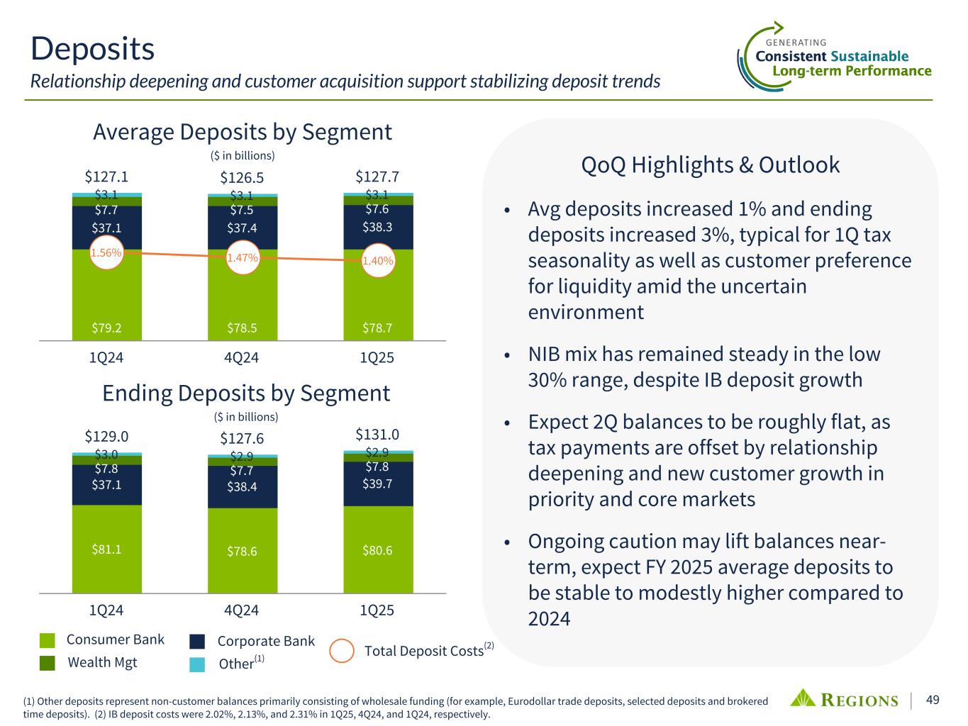 49 QoQ Highlights & Outlook • Avg deposits increased 1% and ending deposits increased 3%, typical for 1Q tax seasonality as well as customer preference for liquidity amid the uncertain environment • NIB mix has remained steady in the low 30% range, despite IB deposit growth • Expect 2Q balances to be roughly flat, as tax payments are offset by relationship deepening and new customer growth in priority and core markets • Ongoing caution may lift balances near- term, expect FY 2025 average deposits to be stable to modestly higher compared to 2024 $129.0 $127.6 $131.0 $81.1 $78.6 $80.6 $37.1 $38.4 $39.7 $7.8 $7.7 $7.8 $3.0 $2.9 $2.9 1Q24 4Q24 1Q25 $127.1 $126.5 $127.7 $79.2 $78.5 $78.7 $37.1 $37.4 $38.3 $7.7 $7.5 $7.6 $3.1 $3.1 $3.1 1.56% 1.47% 1.40% 1Q24 4Q24 1Q25 (1) Other deposits represent non-customer balances primarily consisting of wholesale funding (for example, Eurodollar trade deposits, selected deposits and brokered time deposits). (2) IB deposit costs were 2.02%, 2.13%, and 2.31% in 1Q25, 4Q24, and 1Q24, respectively. Average Deposits by Segment ($ in billions) Deposits Relationship deepening and customer acquisition support stabilizing deposit trends Wealth Mgt Other(1) Consumer Bank Corporate Bank Ending Deposits by Segment ($ in billions) Total Deposit Costs(2)
