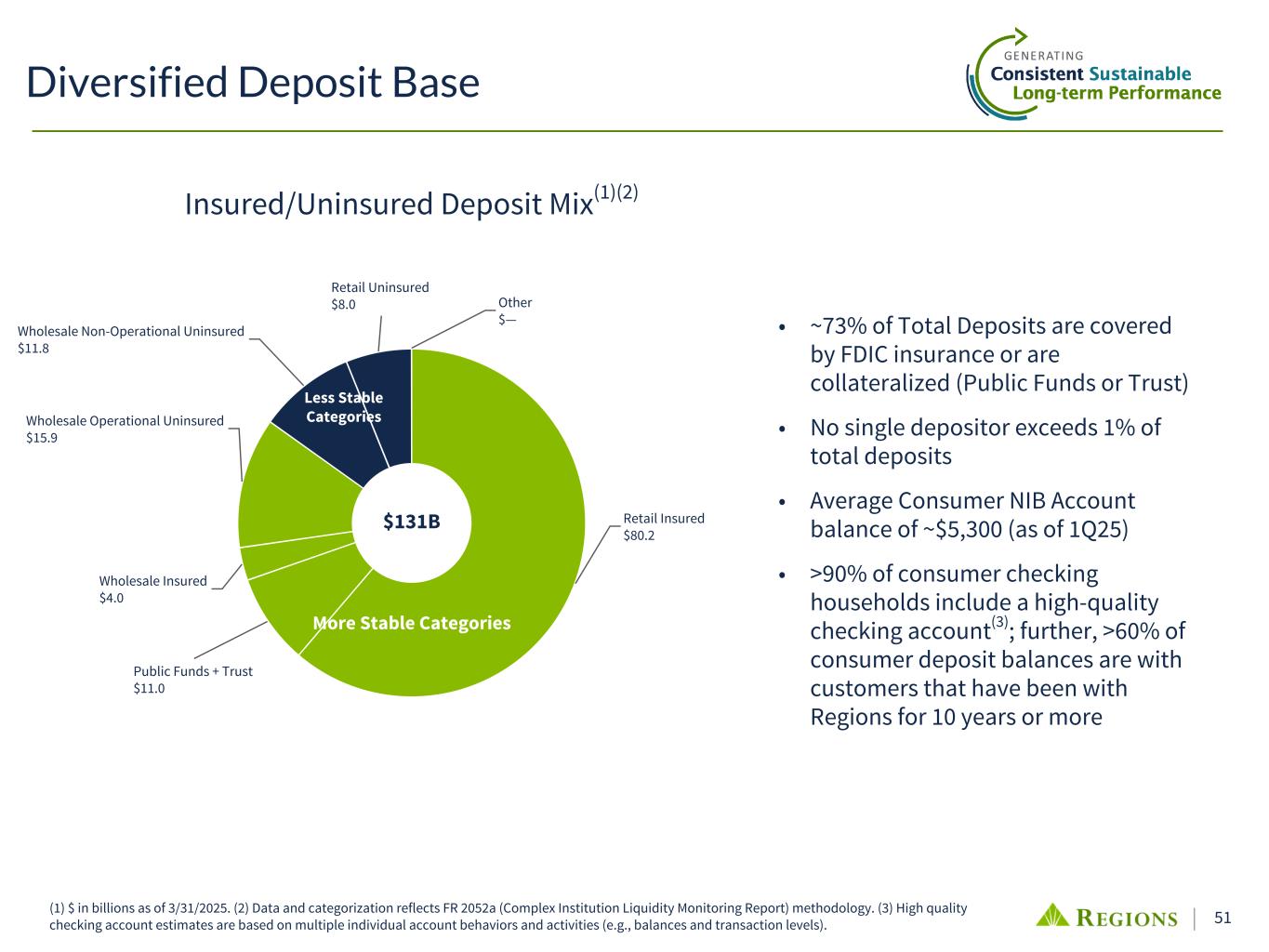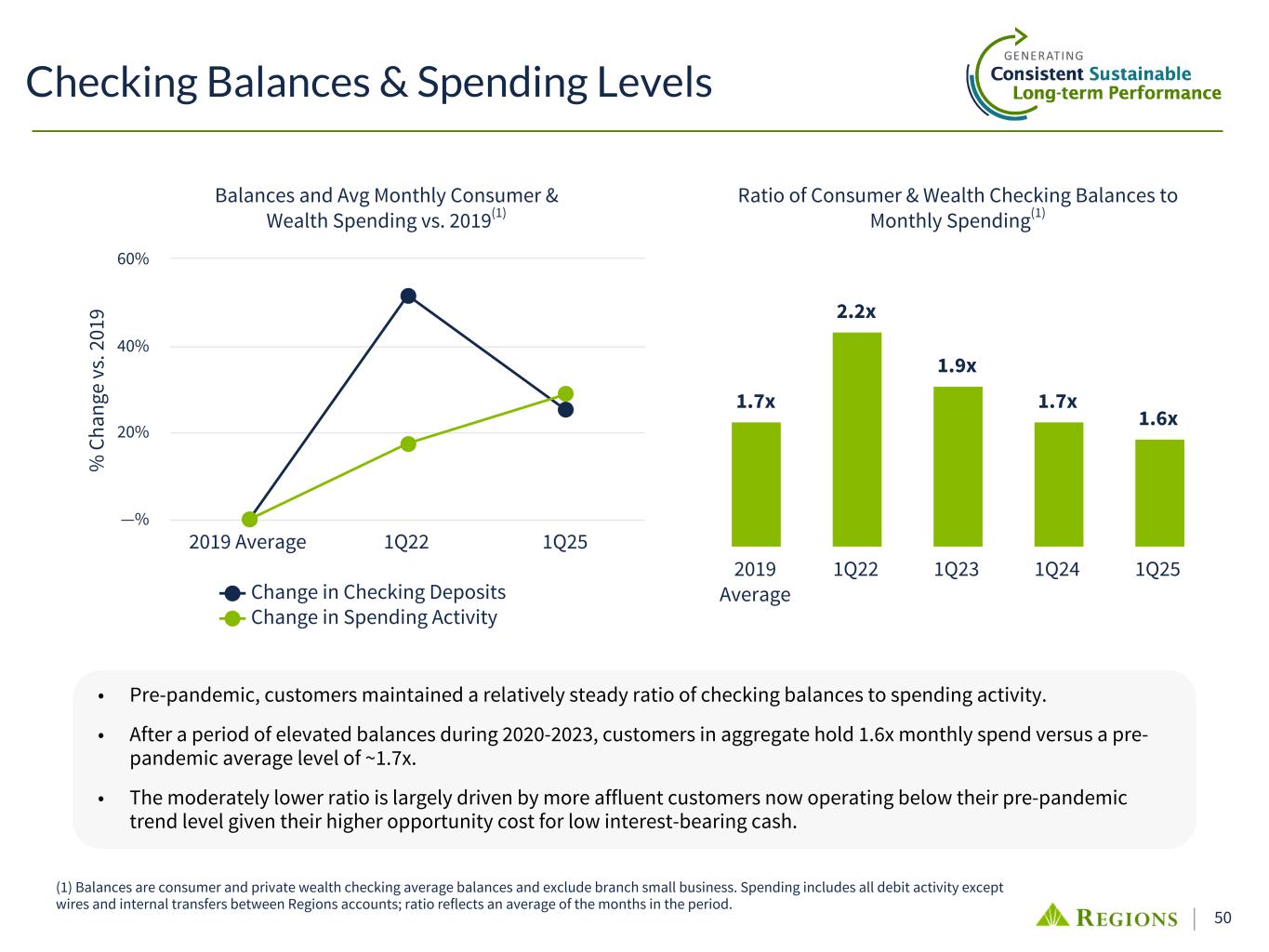 50 • Pre-pandemic, customers maintained a relatively steady ratio of checking balances to spending activity. • After a period of elevated balances during 2020-2023, customers in aggregate hold 1.6x monthly spend versus a pre- pandemic average level of ~1.7x. • The moderately lower ratio is largely driven by more affluent customers now operating below their pre-pandemic trend level given their higher opportunity cost for low interest-bearing cash. Checking Balances & Spending Levels % C ha ng e vs . 2 01 9 Change in Checking Deposits Change in Spending Activity 2019 Average 1Q22 1Q25 —% 20% 40% 60% Balances and Avg Monthly Consumer & Wealth Spending vs. 2019(1) 1.7x 2.2x 1.9x 1.7x 1.6x 2019 Average 1Q22 1Q23 1Q24 1Q25 Ratio of Consumer & Wealth Checking Balances to Monthly Spending(1) (1) Balances are consumer and private wealth checking average balances and exclude branch small business. Spending includes all debit activity except wires and internal transfers between Regions accounts; ratio reflects an average of the months in the period.
