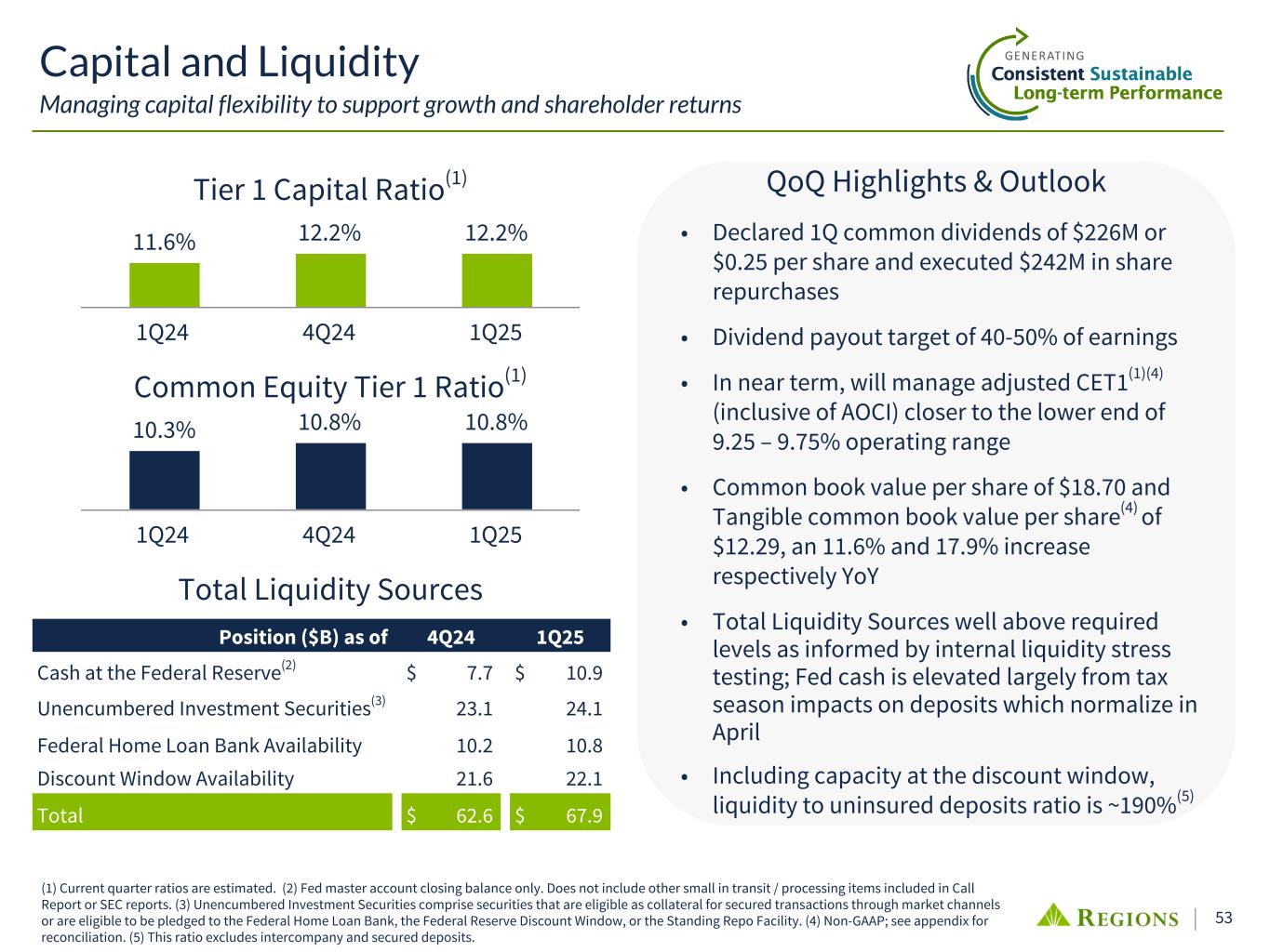 4 2.5% 1.8% Peer Median RF Capital Strength Soundness: Robust capital balances and strong organic capital generation position Regions well for full range of potential economic conditions • Hedge program introduced in 2018 to protect NIM against falling interest rates was highly effective • Actions taken in 2022 and beyond to protect NIM if rates decrease now fully active • Stable organic capital generation is a strong first line of defense against losses 2024 CCAR Capital Degradation(1) Proactive Interest Rate Hedging Capital Resiliency (1) CET1 degradation results from the Federal Reserve's modeled results for the Severely Adverse Scenario in 2024 Stress Test. (2) Pro forma Post-Stress Capital calculated using 4Q24 reported CET1 and the Federal Reserve's modeled capital degradation in 2024 Stress Test. (3) PPI Coverage of Stressed Losses is calculated as the Federal Reserve's modeled 9-quarter PPI divided by 9-quarter Provision Expense in the 2024 Stress Test. Peers include CCAR participants: CFG, FITB, HBAN, KEY, MTB, PNC, TFC, USB. Source: 2024 Federal Reserve Stress Test Results - June 2024; FR Y-9C 10.80% 10.57% 10.63% 11.68% 10.52% 10.53% 10.80% 11.92% 11.53% 6.70% 7.97% 8.23% 8.38% 8.72% 8.93% 9.00% 9.32% 9.33% 4.1% 2.6% 2.4% 3.3% 1.8% 1.6% 1.8% 2.6% 2.2% Pro forma Post-Stress CET1 CCAR 2024 Degradation Peer 1 Peer 2 Peer 3 Peer 4 Peer 5 Peer 6 RF Peer 7 Peer 8 37.4% 52.0% 53.8% 59.4% 63.1% 66.5% 70.5% 71.8% 75.9% Peer 1 Peer 4 Peer 7 Peer 2 Peer 8 Peer 3 Peer 6 Peer 5 RF • Prudent risk management evident in Federal Reserve's stress testing results Pro Forma Post-Stress Capital(2) Pre-Tax Pre-Provision Income Coverage of Stressed Losses(3)