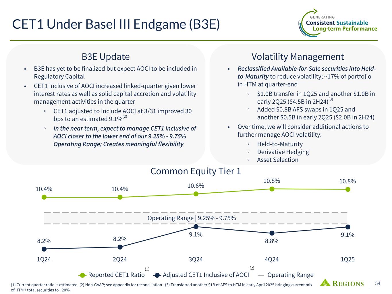 53 QoQ Highlights & Outlook • Declared 1Q common dividends of $226M or $0.25 per share and executed $242M in share repurchases • Dividend payout target of 40-50% of earnings • In near term, will manage adjusted CET1(1)(4) (inclusive of AOCI) closer to the lower end of 9.25 – 9.75% operating range • Common book value per share of $18.70 and Tangible common book value per share(4) of $12.29, an 11.6% and 17.9% increase respectively YoY • Total Liquidity Sources well above required levels as informed by internal liquidity stress testing; Fed cash is elevated largely from tax season impacts on deposits which normalize in April • Including capacity at the discount window, liquidity to uninsured deposits ratio is ~190%(5) 10.3% 10.8% 10.8% 1Q24 4Q24 1Q25 Capital and Liquidity Managing capital flexibility to support growth and shareholder returns 11.6% 12.2% 12.2% 1Q24 4Q24 1Q25 Tier 1 Capital Ratio(1) Common Equity Tier 1 Ratio(1) Position ($B) as of 4Q24 1Q25 Cash at the Federal Reserve(2) $ 7.7 $ 10.9 Unencumbered Investment Securities(3) 23.1 24.1 Federal Home Loan Bank Availability 10.2 10.8 Discount Window Availability 21.6 22.1 Total $ 62.6 $ 67.9 (1) Current quarter ratios are estimated. (2) Fed master account closing balance only. Does not include other small in transit / processing items included in Call Report or SEC reports. (3) Unencumbered Investment Securities comprise securities that are eligible as collateral for secured transactions through market channels or are eligible to be pledged to the Federal Home Loan Bank, the Federal Reserve Discount Window, or the Standing Repo Facility. (4) Non-GAAP; see appendix for reconciliation. (5) This ratio excludes intercompany and secured deposits. Total Liquidity Sources