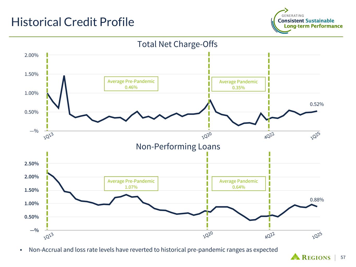 56 Continuous Improvement in Risk Management Our commitment to strengthening credit risk disciplines and intentional portfolio shaping over the past decade-plus leaves us well positioned for sound, profitable growth Strong Origination Disciplines Aligned with Comprehensive Risk Framework ☑ Enhanced risk framework through expanded controls, policies and procedures ☑ Invested in data, analytics and market benchmarks to provide early-warning indicators and dynamic industry outlooks ☑ Centralized credit products underwriting, servicing, and exposure management within specialized lending units and enhanced approval structure for higher-risk portfolios ☑ Advanced risk rating methodologies and stress testing capabilities ☑ Modified incentive plans and pricing frameworks to better promote risk- reward alignment Active Portfolio Management and Non-Core Business Exits ☑ Derisked Commercial Real Estate Portfolio by diversifying into less cyclical sectors ☑ Focused growth in higher quality relationships and segments including investment grade utilities, REITs, asset securitizations, and subscription lines ☑ Actively reduced percent of portfolio comprised of leveraged loans and other higher risk segments ☑ Exited, reduced, or realigned portfolios (Oil Field Services, SoFi, GreenSky, Indirect Auto lending) ☑ Exited non-core businesses including Regions Insurance and Morgan Keegan ☑ Enhanced interest rate risk management through proactive hedging strategies Case Studies in Portfolio De-Risking 22% 16% 14% Co ns tr uc tio n an d La nd 2010 2020 2024 2010 2020 2024 In ve st m en t G ra de Eq ui va le nt s O ilf ie ld S er vi ce s 20% 29% 36% 36% 17% 14% % of Real Estate Loans % of Business Loans % of Energy Loans 2010 2020 2024