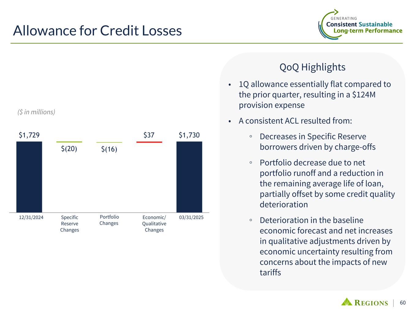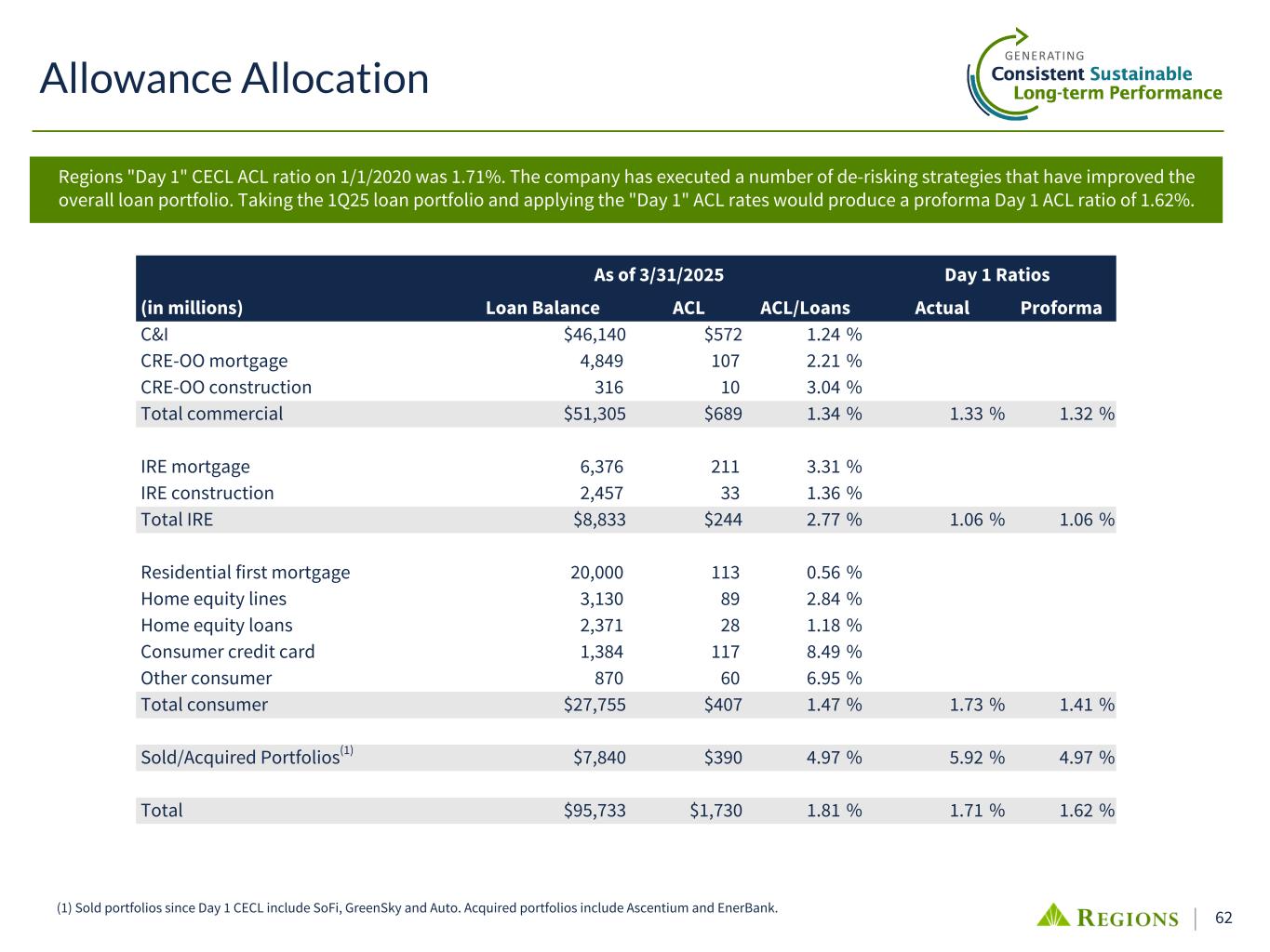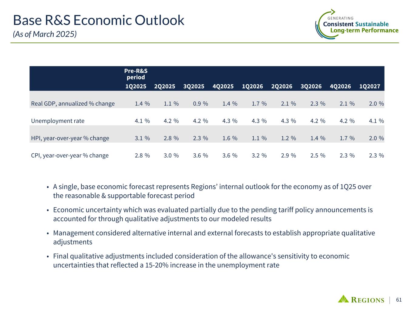 61 Pre-R&S period 1Q2025 2Q2025 3Q2025 4Q2025 1Q2026 2Q2026 3Q2026 4Q2026 1Q2027 Real GDP, annualized % change 1.4 % 1.1 % 0.9 % 1.4 % 1.7 % 2.1 % 2.3 % 2.1 % 2.0 % Unemployment rate 4.1 % 4.2 % 4.2 % 4.3 % 4.3 % 4.3 % 4.2 % 4.2 % 4.1 % HPI, year-over-year % change 3.1 % 2.8 % 2.3 % 1.6 % 1.1 % 1.2 % 1.4 % 1.7 % 2.0 % CPI, year-over-year % change 2.8 % 3.0 % 3.6 % 3.6 % 3.2 % 2.9 % 2.5 % 2.3 % 2.3 % Base R&S Economic Outlook (As of March 2025) • A single, base economic forecast represents Regions’ internal outlook for the economy as of 1Q25 over the reasonable & supportable forecast period • Economic uncertainty which was evaluated partially due to the pending tariff policy announcements is accounted for through qualitative adjustments to our modeled results • Management considered alternative internal and external forecasts to establish appropriate qualitative adjustments • Final qualitative adjustments included consideration of the allowance's sensitivity to economic uncertainties that reflected a 15-20% increase in the unemployment rate