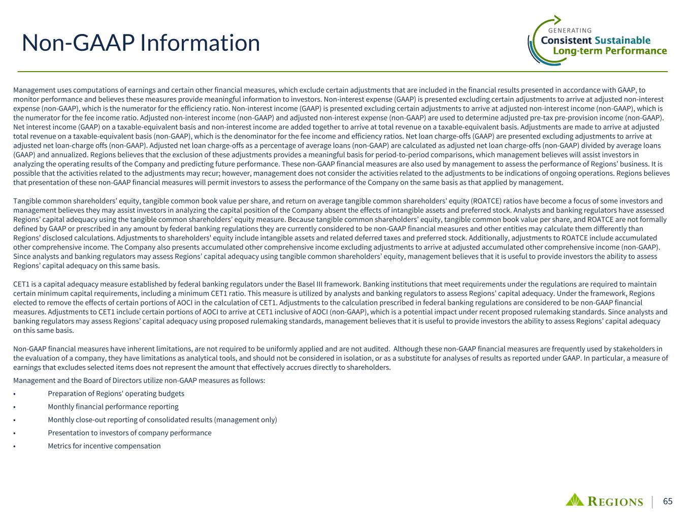 65 Management uses computations of earnings and certain other financial measures, which exclude certain adjustments that are included in the financial results presented in accordance with GAAP, to monitor performance and believes these measures provide meaningful information to investors. Non-interest expense (GAAP) is presented excluding certain adjustments to arrive at adjusted non-interest expense (non-GAAP), which is the numerator for the efficiency ratio. Non-interest income (GAAP) is presented excluding certain adjustments to arrive at adjusted non-interest income (non-GAAP), which is the numerator for the fee income ratio. Adjusted non-interest income (non-GAAP) and adjusted non-interest expense (non-GAAP) are used to determine adjusted pre-tax pre-provision income (non-GAAP). Net interest income (GAAP) on a taxable-equivalent basis and non-interest income are added together to arrive at total revenue on a taxable-equivalent basis. Adjustments are made to arrive at adjusted total revenue on a taxable-equivalent basis (non-GAAP), which is the denominator for the fee income and efficiency ratios. Net loan charge-offs (GAAP) are presented excluding adjustments to arrive at adjusted net loan-charge offs (non-GAAP). Adjusted net loan charge-offs as a percentage of average loans (non-GAAP) are calculated as adjusted net loan charge-offs (non-GAAP) divided by average loans (GAAP) and annualized. Regions believes that the exclusion of these adjustments provides a meaningful basis for period-to-period comparisons, which management believes will assist investors in analyzing the operating results of the Company and predicting future performance. These non-GAAP financial measures are also used by management to assess the performance of Regions’ business. It is possible that the activities related to the adjustments may recur; however, management does not consider the activities related to the adjustments to be indications of ongoing operations. Regions believes that presentation of these non-GAAP financial measures will permit investors to assess the performance of the Company on the same basis as that applied by management. Tangible common shareholders’ equity, tangible common book value per share, and return on average tangible common shareholders' equity (ROATCE) ratios have become a focus of some investors and management believes they may assist investors in analyzing the capital position of the Company absent the effects of intangible assets and preferred stock. Analysts and banking regulators have assessed Regions’ capital adequacy using the tangible common shareholders’ equity measure. Because tangible common shareholders’ equity, tangible common book value per share, and ROATCE are not formally defined by GAAP or prescribed in any amount by federal banking regulations they are currently considered to be non-GAAP financial measures and other entities may calculate them differently than Regions’ disclosed calculations. Adjustments to shareholders' equity include intangible assets and related deferred taxes and preferred stock. Additionally, adjustments to ROATCE include accumulated other comprehensive income. The Company also presents accumulated other comprehensive income excluding adjustments to arrive at adjusted accumulated other comprehensive income (non-GAAP). Since analysts and banking regulators may assess Regions’ capital adequacy using tangible common shareholders’ equity, management believes that it is useful to provide investors the ability to assess Regions’ capital adequacy on this same basis. CET1 is a capital adequacy measure established by federal banking regulators under the Basel III framework. Banking institutions that meet requirements under the regulations are required to maintain certain minimum capital requirements, including a minimum CET1 ratio. This measure is utilized by analysts and banking regulators to assess Regions’ capital adequacy. Under the framework, Regions elected to remove the effects of certain portions of AOCI in the calculation of CET1. Adjustments to the calculation prescribed in federal banking regulations are considered to be non-GAAP financial measures. Adjustments to CET1 include certain portions of AOCI to arrive at CET1 inclusive of AOCI (non-GAAP), which is a potential impact under recent proposed rulemaking standards. Since analysts and banking regulators may assess Regions’ capital adequacy using proposed rulemaking standards, management believes that it is useful to provide investors the ability to assess Regions’ capital adequacy on this same basis. Non-GAAP financial measures have inherent limitations, are not required to be uniformly applied and are not audited. Although these non-GAAP financial measures are frequently used by stakeholders in the evaluation of a company, they have limitations as analytical tools, and should not be considered in isolation, or as a substitute for analyses of results as reported under GAAP. In particular, a measure of earnings that excludes selected items does not represent the amount that effectively accrues directly to shareholders. Management and the Board of Directors utilize non-GAAP measures as follows: • Preparation of Regions' operating budgets • Monthly financial performance reporting • Monthly close-out reporting of consolidated results (management only) • Presentation to investors of company performance • Metrics for incentive compensation Non-GAAP Information