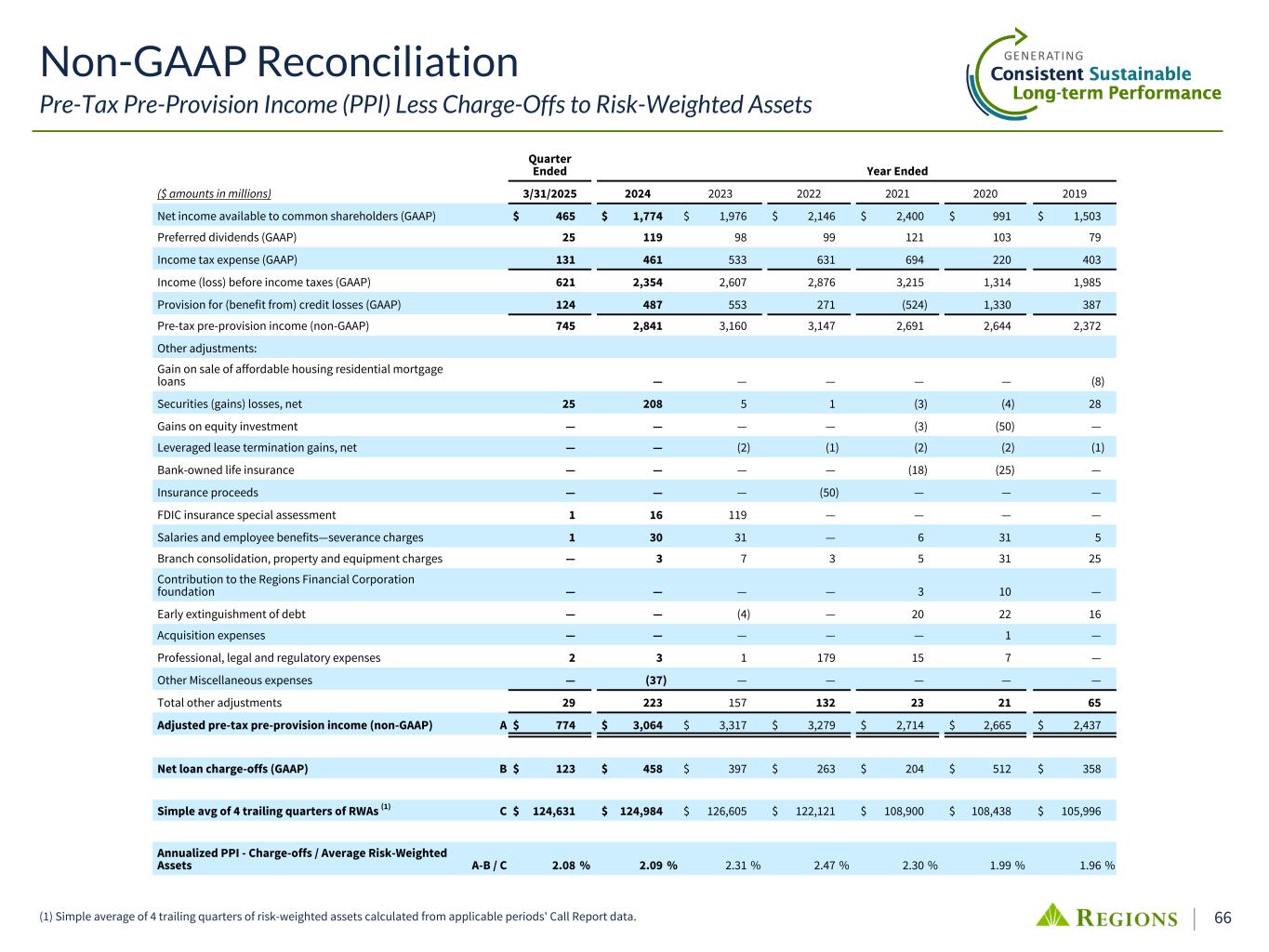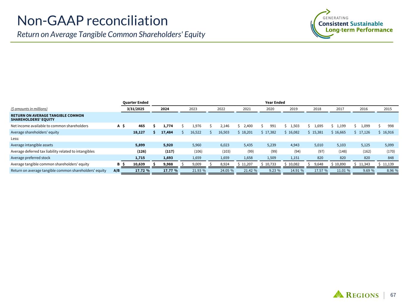 66 Quarter Ended Year Ended ($ amounts in millions) 3/31/2025 2024 2023 2022 2021 2020 2019 Net income available to common shareholders (GAAP) $ 465 $ 1,774 $ 1,976 $ 2,146 $ 2,400 $ 991 $ 1,503 Preferred dividends (GAAP) 25 119 98 99 121 103 79 Income tax expense (GAAP) 131 461 533 631 694 220 403 Income (loss) before income taxes (GAAP) 621 2,354 2,607 2,876 3,215 1,314 1,985 Provision for (benefit from) credit losses (GAAP) 124 487 553 271 (524) 1,330 387 Pre-tax pre-provision income (non-GAAP) 745 2,841 3,160 3,147 2,691 2,644 2,372 Other adjustments: Gain on sale of affordable housing residential mortgage loans — — — — — (8) Securities (gains) losses, net 25 208 5 1 (3) (4) 28 Gains on equity investment — — — — (3) (50) — Leveraged lease termination gains, net — — (2) (1) (2) (2) (1) Bank-owned life insurance — — — — (18) (25) — Insurance proceeds — — — (50) — — — FDIC insurance special assessment 1 16 119 — — — — Salaries and employee benefits—severance charges 1 30 31 — 6 31 5 Branch consolidation, property and equipment charges — 3 7 3 5 31 25 Contribution to the Regions Financial Corporation foundation — — — — 3 10 — Early extinguishment of debt — — (4) — 20 22 16 Acquisition expenses — — — — — 1 — Professional, legal and regulatory expenses 2 3 1 179 15 7 — Other Miscellaneous expenses — (37) — — — — — Total other adjustments 29 223 157 132 23 21 65 Adjusted pre-tax pre-provision income (non-GAAP) A $ 774 $ 3,064 $ 3,317 $ 3,279 $ 2,714 $ 2,665 $ 2,437 Net loan charge-offs (GAAP) B $ 123 $ 458 $ 397 $ 263 $ 204 $ 512 $ 358 Simple avg of 4 trailing quarters of RWAs (1) C $ 124,631 $ 124,984 $ 126,605 $ 122,121 $ 108,900 $ 108,438 $ 105,996 Annualized PPI - Charge-offs / Average Risk-Weighted Assets A-B / C 2.08 % 2.09 % 2.31 % 2.47 % 2.30 % 1.99 % 1.96 % (1) Simple average of 4 trailing quarters of risk-weighted assets calculated from applicable periods' Call Report data. Non-GAAP Reconciliation Pre-Tax Pre-Provision Income (PPI) Less Charge-Offs to Risk-Weighted Assets