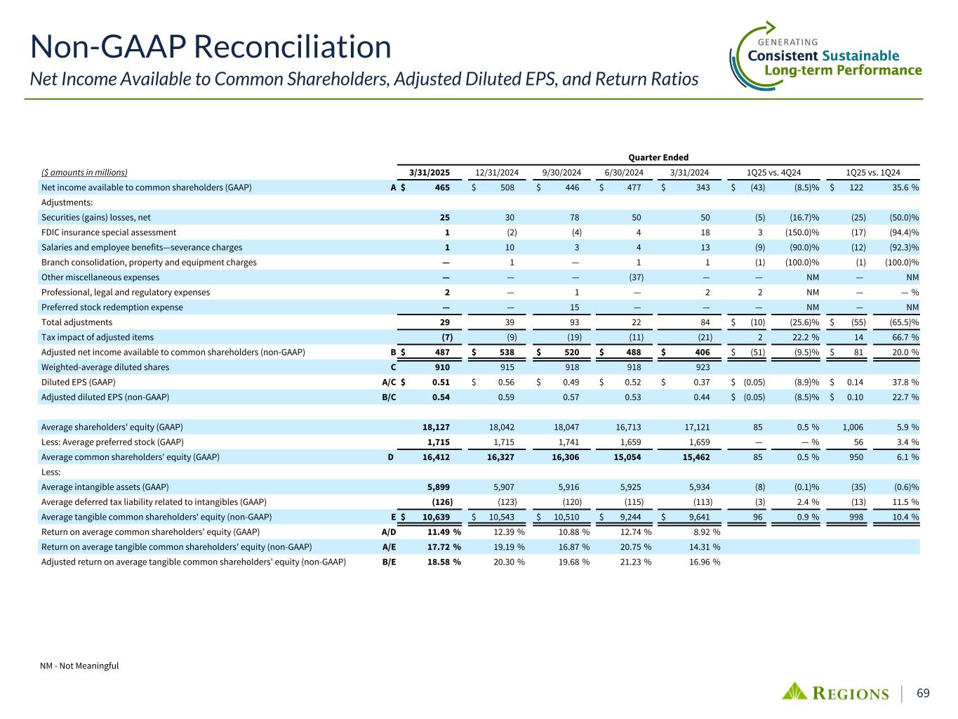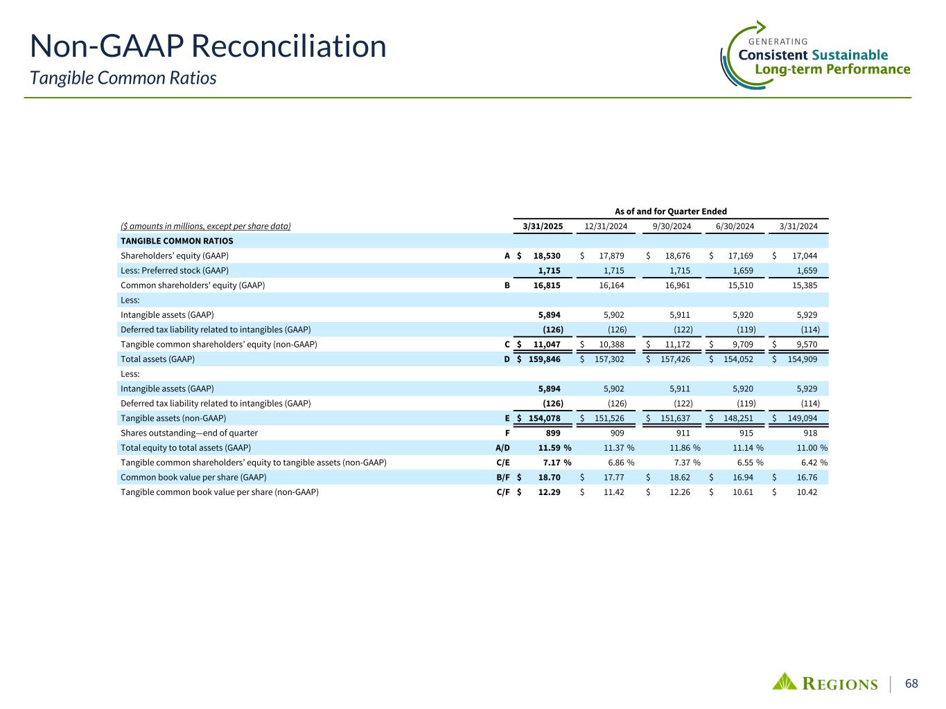 68 As of and for Quarter Ended ($ amounts in millions, except per share data) 3/31/2025 12/31/2024 9/30/2024 6/30/2024 3/31/2024 TANGIBLE COMMON RATIOS Shareholders’ equity (GAAP) A $ 18,530 $ 17,879 $ 18,676 $ 17,169 $ 17,044 Less: Preferred stock (GAAP) 1,715 1,715 1,715 1,659 1,659 Common shareholders' equity (GAAP) B 16,815 16,164 16,961 15,510 15,385 Less: Intangible assets (GAAP) 5,894 5,902 5,911 5,920 5,929 Deferred tax liability related to intangibles (GAAP) (126) (126) (122) (119) (114) Tangible common shareholders’ equity (non-GAAP) C $ 11,047 $ 10,388 $ 11,172 $ 9,709 $ 9,570 Total assets (GAAP) D $ 159,846 $ 157,302 $ 157,426 $ 154,052 $ 154,909 Less: Intangible assets (GAAP) 5,894 5,902 5,911 5,920 5,929 Deferred tax liability related to intangibles (GAAP) (126) (126) (122) (119) (114) Tangible assets (non-GAAP) E $ 154,078 $ 151,526 $ 151,637 $ 148,251 $ 149,094 Shares outstanding—end of quarter F 899 909 911 915 918 Total equity to total assets (GAAP) A/D 11.59 % 11.37 % 11.86 % 11.14 % 11.00 % Tangible common shareholders’ equity to tangible assets (non-GAAP) C/E 7.17 % 6.86 % 7.37 % 6.55 % 6.42 % Common book value per share (GAAP) B/F $ 18.70 $ 17.77 $ 18.62 $ 16.94 $ 16.76 Tangible common book value per share (non-GAAP) C/F $ 12.29 $ 11.42 $ 12.26 $ 10.61 $ 10.42 Non-GAAP Reconciliation Tangible Common Ratios
