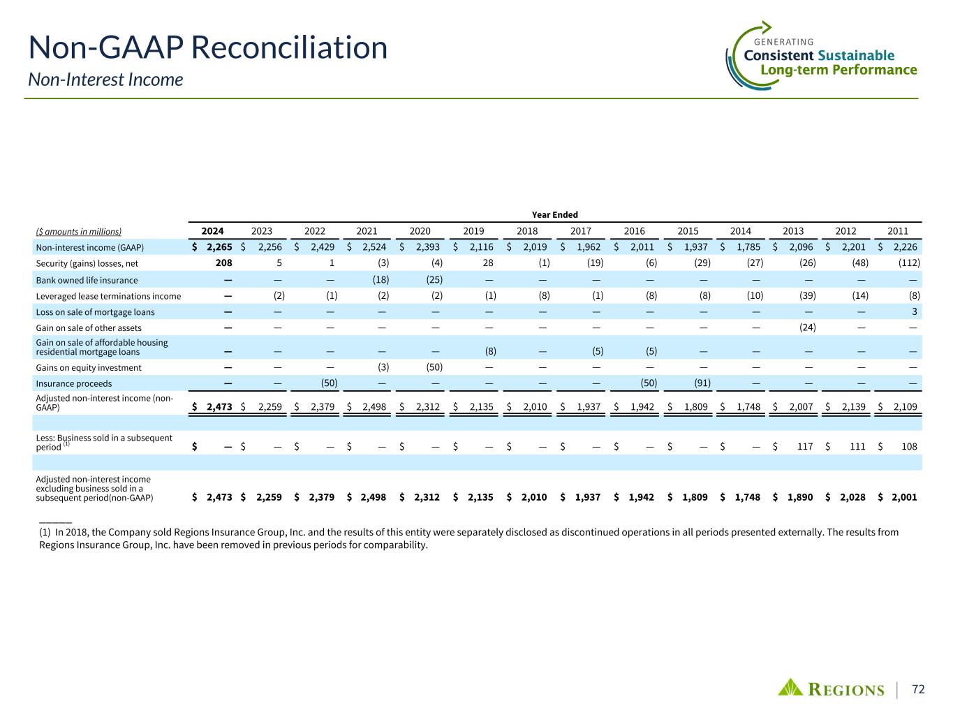 72 Non-GAAP Reconciliation Non-Interest Income Year Ended ($ amounts in millions) 2024 2023 2022 2021 2020 2019 2018 2017 2016 2015 2014 2013 2012 2011 Non-interest income (GAAP) $ 2,265 $ 2,256 $ 2,429 $ 2,524 $ 2,393 $ 2,116 $ 2,019 $ 1,962 $ 2,011 $ 1,937 $ 1,785 $ 2,096 $ 2,201 $ 2,226 Security (gains) losses, net 208 5 1 (3) (4) 28 (1) (19) (6) (29) (27) (26) (48) (112) Bank owned life insurance — — — (18) (25) — — — — — — — — — Leveraged lease terminations income — (2) (1) (2) (2) (1) (8) (1) (8) (8) (10) (39) (14) (8) Loss on sale of mortgage loans — — — — — — — — — — — — — 3 Gain on sale of other assets — — — — — — — — — — — (24) — — Gain on sale of affordable housing residential mortgage loans — — — — — (8) — (5) (5) — — — — — Gains on equity investment — — — (3) (50) — — — — — — — — — Insurance proceeds — — (50) — — — — — (50) (91) — — — — Adjusted non-interest income (non- GAAP) $ 2,473 $ 2,259 $ 2,379 $ 2,498 $ 2,312 $ 2,135 $ 2,010 $ 1,937 $ 1,942 $ 1,809 $ 1,748 $ 2,007 $ 2,139 $ 2,109 Less: Business sold in a subsequent period (1) $ — $ — $ — $ — $ — $ — $ — $ — $ — $ — $ — $ 117 $ 111 $ 108 Adjusted non-interest income excluding business sold in a subsequent period(non-GAAP) $ 2,473 $ 2,259 $ 2,379 $ 2,498 $ 2,312 $ 2,135 $ 2,010 $ 1,937 $ 1,942 $ 1,809 $ 1,748 $ 1,890 $ 2,028 $ 2,001 _____ (1) In 2018, the Company sold Regions Insurance Group, Inc. and the results of this entity were separately disclosed as discontinued operations in all periods presented externally. The results from Regions Insurance Group, Inc. have been removed in previous periods for comparability.