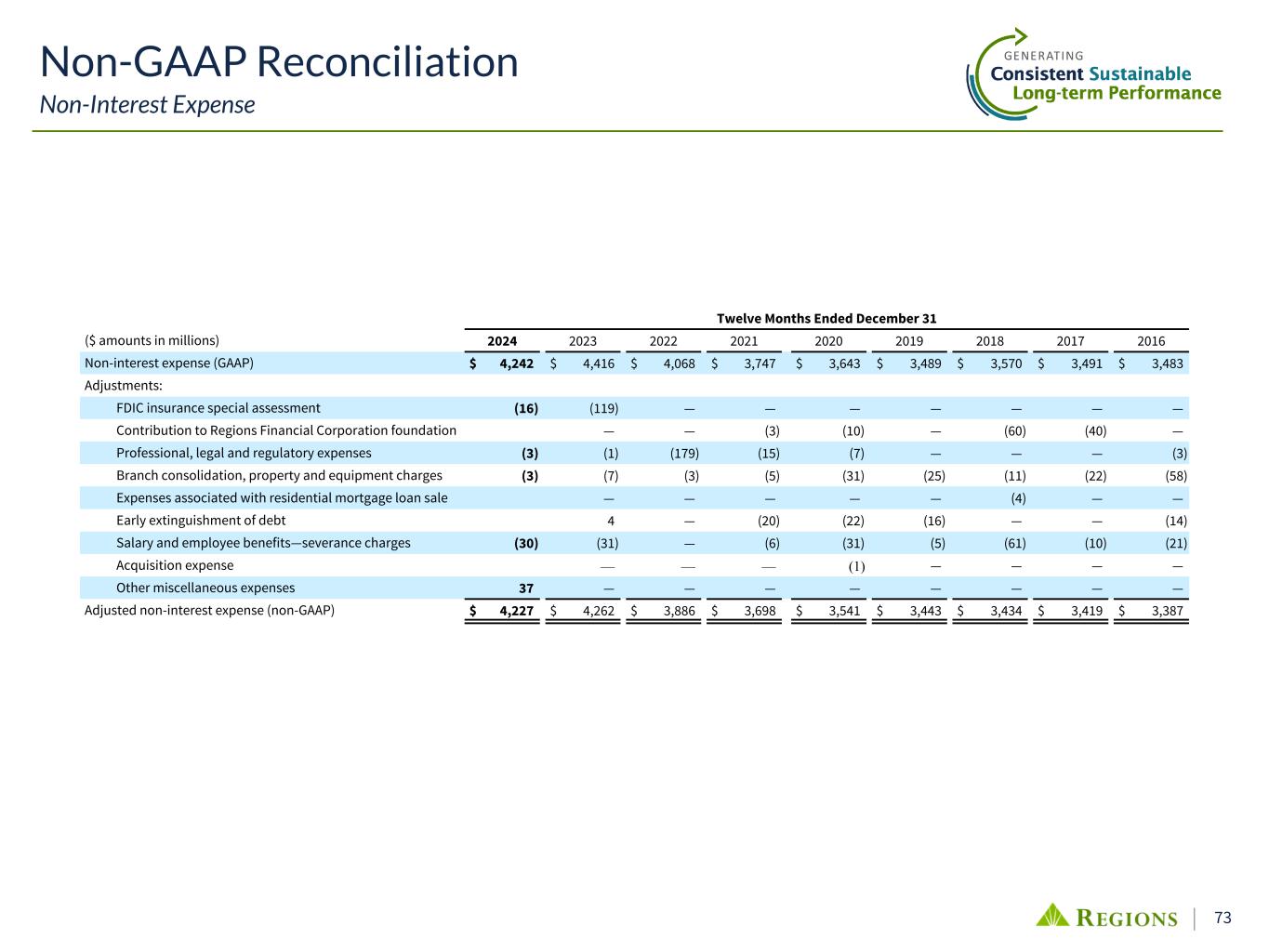 73 Non-GAAP Reconciliation Non-Interest Expense Twelve Months Ended December 31 ($ amounts in millions) 2024 2023 2022 2021 2020 2019 2018 2017 2016 Non-interest expense (GAAP) $ 4,242 $ 4,416 $ 4,068 $ 3,747 $ 3,643 $ 3,489 $ 3,570 $ 3,491 $ 3,483 Adjustments: FDIC insurance special assessment (16) (119) — — — — — — — Contribution to Regions Financial Corporation foundation — — (3) (10) — (60) (40) — Professional, legal and regulatory expenses (3) (1) (179) (15) (7) — — — (3) Branch consolidation, property and equipment charges (3) (7) (3) (5) (31) (25) (11) (22) (58) Expenses associated with residential mortgage loan sale — — — — — (4) — — Early extinguishment of debt 4 — (20) (22) (16) — — (14) Salary and employee benefits—severance charges (30) (31) — (6) (31) (5) (61) (10) (21) Acquisition expense — — — (1) — — — — Other miscellaneous expenses 37 — — — — — — — — Adjusted non-interest expense (non-GAAP) $ 4,227 $ 4,262 $ 3,886 $ 3,698 $ 3,541 $ 3,443 $ 3,434 $ 3,419 $ 3,387