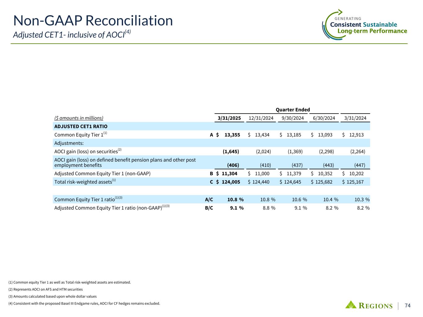 74 Quarter Ended ($ amounts in millions) 3/31/2025 12/31/2024 9/30/2024 6/30/2024 3/31/2024 ADJUSTED CET1 RATIO Common Equity Tier 1(1) A $ 13,355 $ 13,434 $ 13,185 $ 13,093 $ 12,913 Adjustments: AOCI gain (loss) on securities(2) (1,645) (2,024) (1,369) (2,298) (2,264) AOCI gain (loss) on defined benefit pension plans and other post employment benefits (406) (410) (437) (443) (447) Adjusted Common Equity Tier 1 (non-GAAP) B $ 11,304 $ 11,000 $ 11,379 $ 10,352 $ 10,202 Total risk-weighted assets(1) C $ 124,005 $ 124,440 $ 124,645 $ 125,682 $ 125,167 Common Equity Tier 1 ratio(1)(3) A/C 10.8 % 10.8 % 10.6 % 10.4 % 10.3 % Adjusted Common Equity Tier 1 ratio (non-GAAP)(1)(3) B/C 9.1 % 8.8 % 9.1 % 8.2 % 8.2 % Non-GAAP Reconciliation Adjusted CET1- inclusive of AOCI(4) (1) Common equity Tier 1 as well as Total risk-weighted assets are estimated. (2) Represents AOCI on AFS and HTM securities (3) Amounts calculated based upon whole dollar values (4) Consistent with the proposed Basel III Endgame rules, AOCI for CF hedges remains excluded.