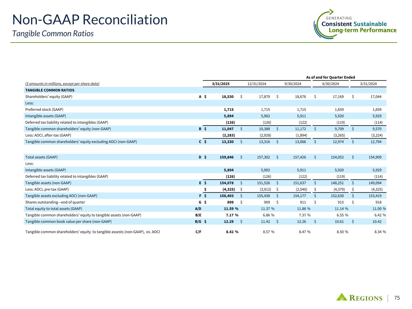 75 As of and for Quarter Ended ($ amounts in millions, except per share data) 3/31/2025 12/31/2024 9/30/2024 6/30/2024 3/31/2024 TANGIBLE COMMON RATIOS Shareholders’ equity (GAAP) A $ 18,530 $ 17,879 $ 18,676 $ 17,169 $ 17,044 Less: Preferred stock (GAAP) 1,715 1,715 1,715 1,659 1,659 Intangible assets (GAAP) 5,894 5,902 5,911 5,920 5,929 Deferred tax liability related to intangibles (GAAP) (126) (126) (122) (119) (114) Tangible common shareholders’ equity (non-GAAP) B $ 11,047 $ 10,388 $ 11,172 $ 9,709 $ 9,570 Less: AOCI, after-tax (GAAP) (2,283) (2,928) (1,894) (3,265) (3,224) Tangible common shareholders’ equity excluding AOCI (non-GAAP) C $ 13,330 $ 13,316 $ 13,066 $ 12,974 $ 12,794 Total assets (GAAP) D $ 159,846 $ 157,302 $ 157,426 $ 154,052 $ 154,909 Less: Intangible assets (GAAP) 5,894 5,902 5,911 5,920 5,929 Deferred tax liability related to intangibles (GAAP) (126) (126) (122) (119) (114) Tangible assets (non-GAAP) E $ 154,078 $ 151,526 $ 151,637 $ 148,251 $ 149,094 Less: AOCI, pre-tax (GAAP) $ (4,325) $ (3,912) $ (2,540) $ (4,379) $ (4,325) Tangible assets excluding AOCI (non-GAAP) F $ 158,403 $ 155,438 $ 154,177 $ 152,630 $ 153,419 Shares outstanding—end of quarter G $ 899 $ 909 $ 911 $ 915 $ 918 Total equity to total assets (GAAP) A/D 11.59 % 11.37 % 11.86 % 11.14 % 11.00 % Tangible common shareholders’ equity to tangible assets (non-GAAP) B/E 7.17 % 6.86 % 7.37 % 6.55 % 6.42 % Tangible common book value per share (non-GAAP) B/G $ 12.29 $ 11.42 $ 12.26 $ 10.61 $ 10.42 Tangible common shareholders’ equity to tangible assests (non-GAAP), ex. AOCI C/F 8.42 % 8.57 % 8.47 % 8.50 % 8.34 % Non-GAAP Reconciliation Tangible Common Ratios