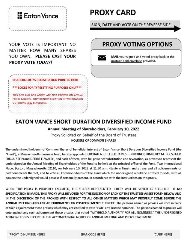 This proxy statement is furnished in connection with the solicitation of proxies by the Board of Trustees of Eaton Vance Short Duration Diversified Income Fund (the “Short Duration Fund”) and Eaton Vance Tax-Advantaged Global Dividend Opportunities Fund (the “Tax-Advantaged Fund”) (each, a “Fund” and together, the “Funds”). The proxies will be voted at the Annual Meeting of Shareholders of each Fund and at any adjournments or postponements thereof. The meeting will be held on Thursday, February 10, 2022 at 11:30 a.m. (Eastern Time) at the principal office of each Fund, Two International Place, Boston, Massachusetts 02110. The meeting will be held for the purposes set forth in the accompanying notice. This proxy material is being mailed to shareholders on or about December 23, 2021.