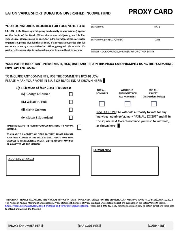 | a. | For Eaton Vance Short Duration Diversified Income Fund, four Class II Trustees, George J. Gorman, William H. Park, Keith Quinton and Susan J. Sutherland, to be elected by shareholders of the Fund; and | ||