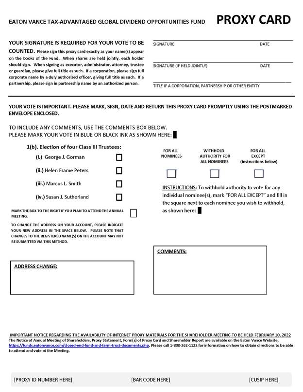 | b. | For Eaton Vance Tax-Advantaged Global Dividend Opportunities Fund, four Class III Trustees, George J. Gorman, Helen Frame Peters, Marcus L. Smith and Susan J. Sutherland, to be elected by shareholders of the Fund. | ||