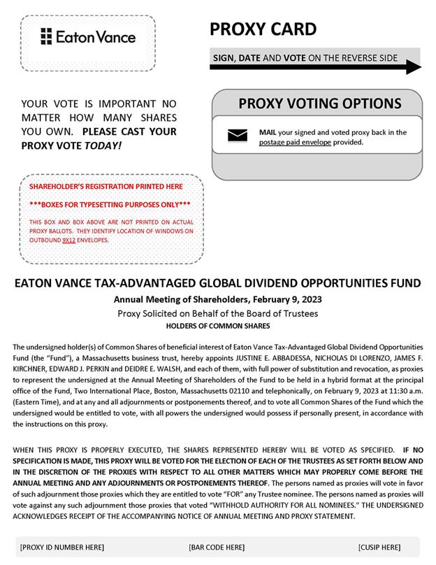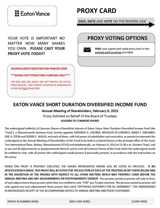 This proxy statement is furnished in connection with the solicitation of proxies by the Board of Trustees of Eaton Vance Short Duration Diversified Income Fund (the “Short Duration Fund”) and Eaton Vance Tax-Advantaged Global Dividend Opportunities Fund (the “Tax-Advantaged Fund”) (each, a “Fund” and together, the “Funds”). The proxies will be voted at the Annual Meeting of Shareholders of each Fund and at any adjournments or postponements thereof (the “Annual Meeting”). The Annual Meeting will be held in a hybrid format on Thursday, February 9, 2023 at 11:30 a.m. (Eastern Time) at the principal office of each Fund, Two International Place, Boston, Massachusetts 02110, and telephonically, as discussed further herein. The Annual Meeting will be held for the purposes set forth in the accompanying notice. This proxy material is being mailed to shareholders on or about December 23, 2022.