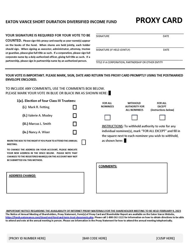 | a. | For Eaton Vance Short Duration Diversified Income Fund, four Class III Trustees, Mark R. Fetting, Valerie A. Mosley, Marcus L. Smith and Nancy A. Wiser, to be elected by shareholders of the Fund; and | ||