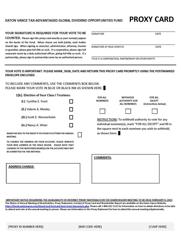 | b. | For Eaton Vance Tax-Advantaged Global Dividend Opportunities Fund, four Class I Trustees, Cynthia E. Frost, Valerie A. Mosley, Scott E. Wennerholm and Nancy A. Wiser, to be elected by shareholders of the Fund. | ||