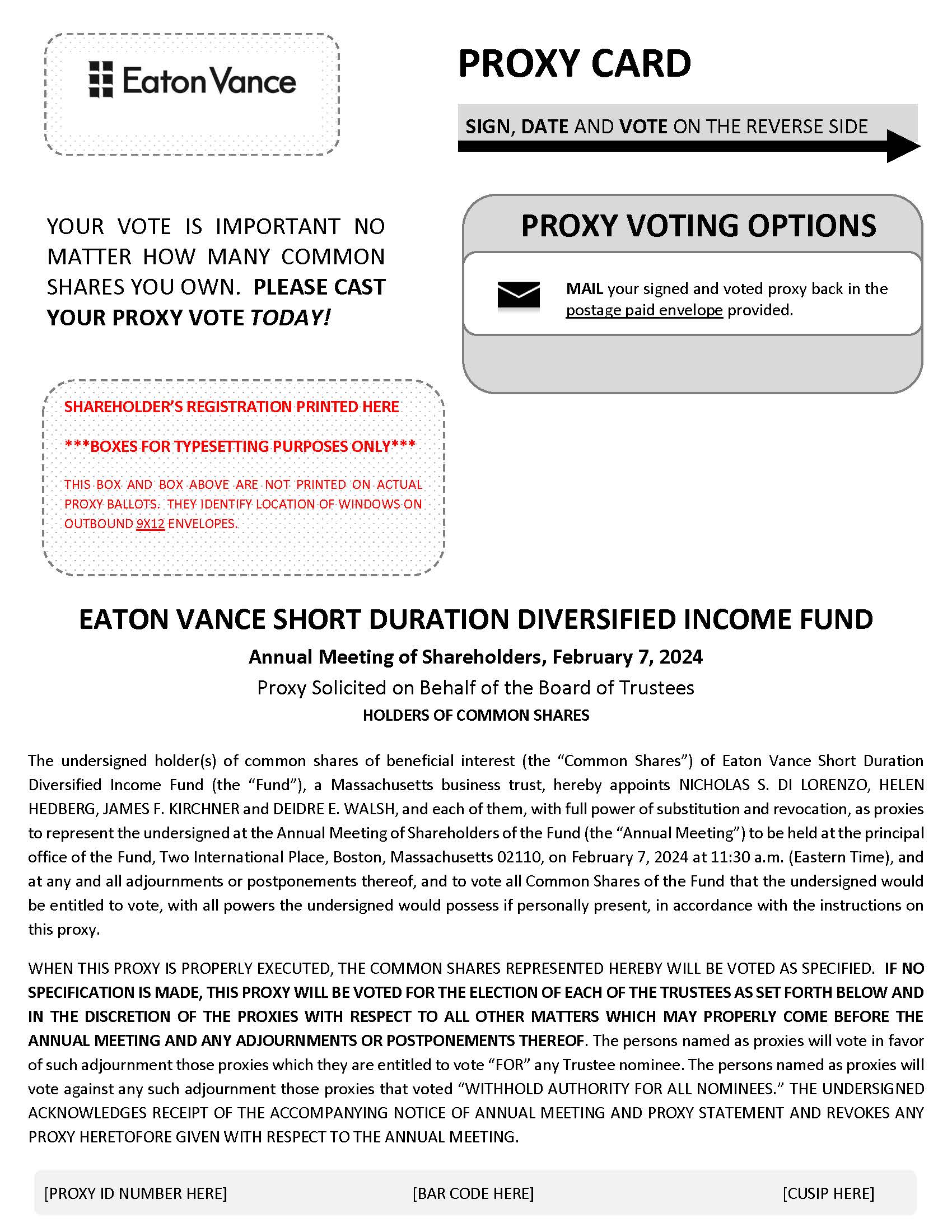 This proxy statement is furnished in connection with the solicitation of proxies by the Board of Trustees of Eaton Vance Short Duration Diversified Income Fund (“Short Duration Fund”) and Eaton Vance Tax-Advantaged Global Dividend Opportunities Fund (“Tax-Advantaged Fund”) (each, a “Fund” and together, the “Funds”). The proxies will be voted at the Annual Meeting of Shareholders of each Fund and at any adjournments or postponements thereof (the “Annual Meeting”). The Annual Meeting will be held on Wednesday, February 7, 2024 at 11:30 a.m. (Eastern Time) at the principal office of each Fund, Two International Place, Boston, Massachusetts 02110, as discussed further herein. The Annual Meeting will be held for the purposes set forth in the accompanying notice. This proxy statement and the enclosed proxy cards are first being sent or given to shareholders on or about December 22, 2023.