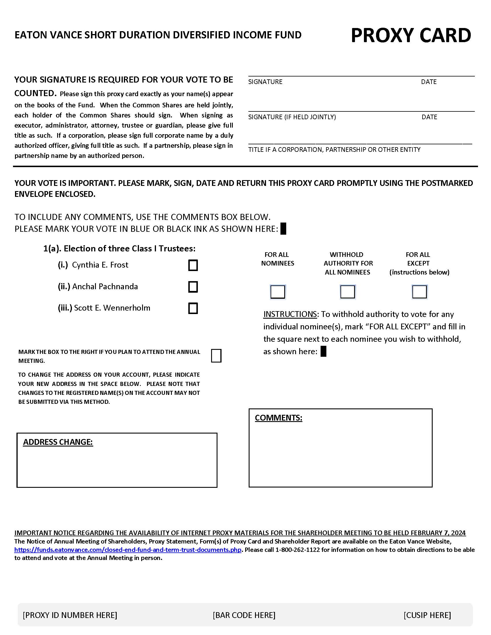 | a. | For Eaton Vance Short Duration Diversified Income Fund, three Class I Trustees, Cynthia E. Frost, Anchal Pachnanda and Scott E. Wennerholm, to be elected by shareholders of the Fund; and | ||
