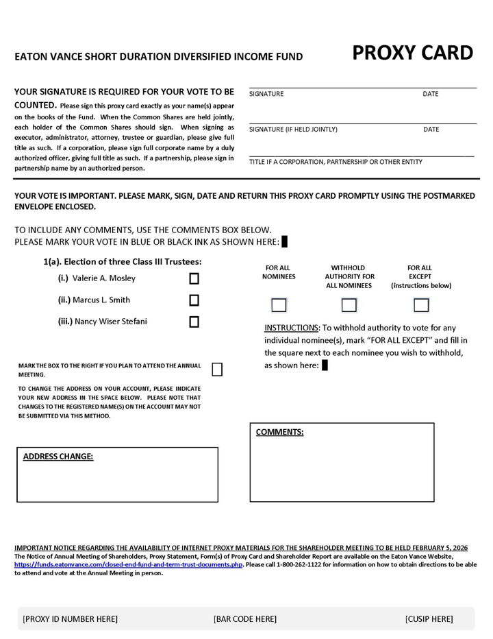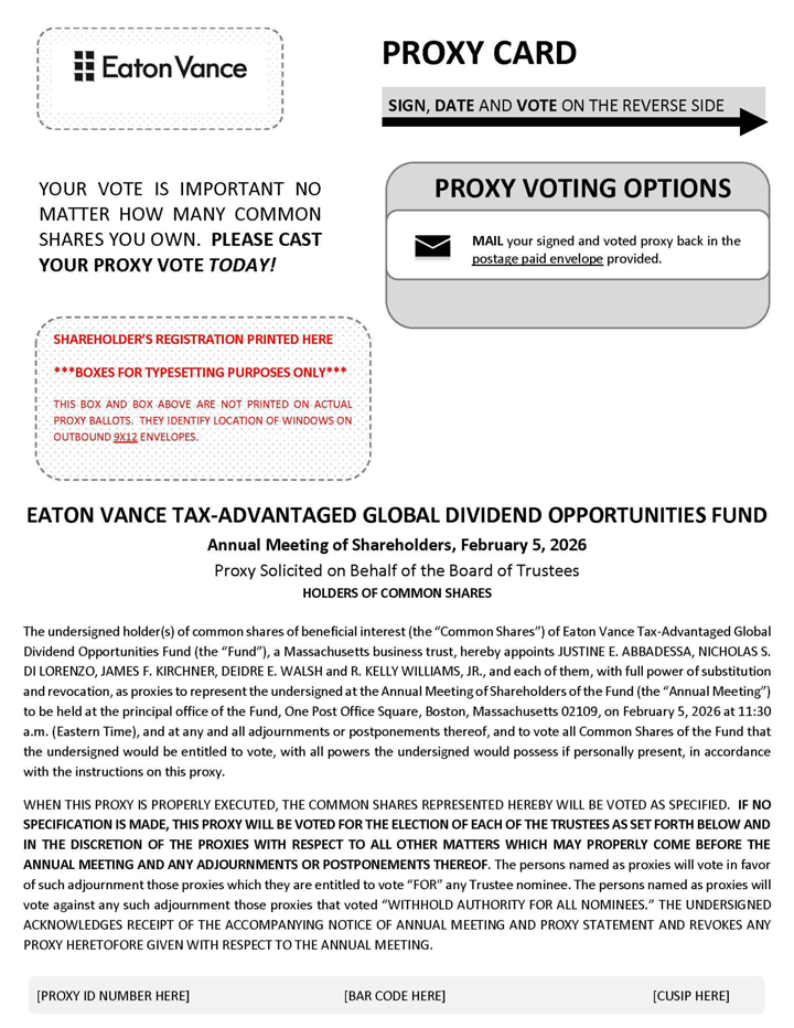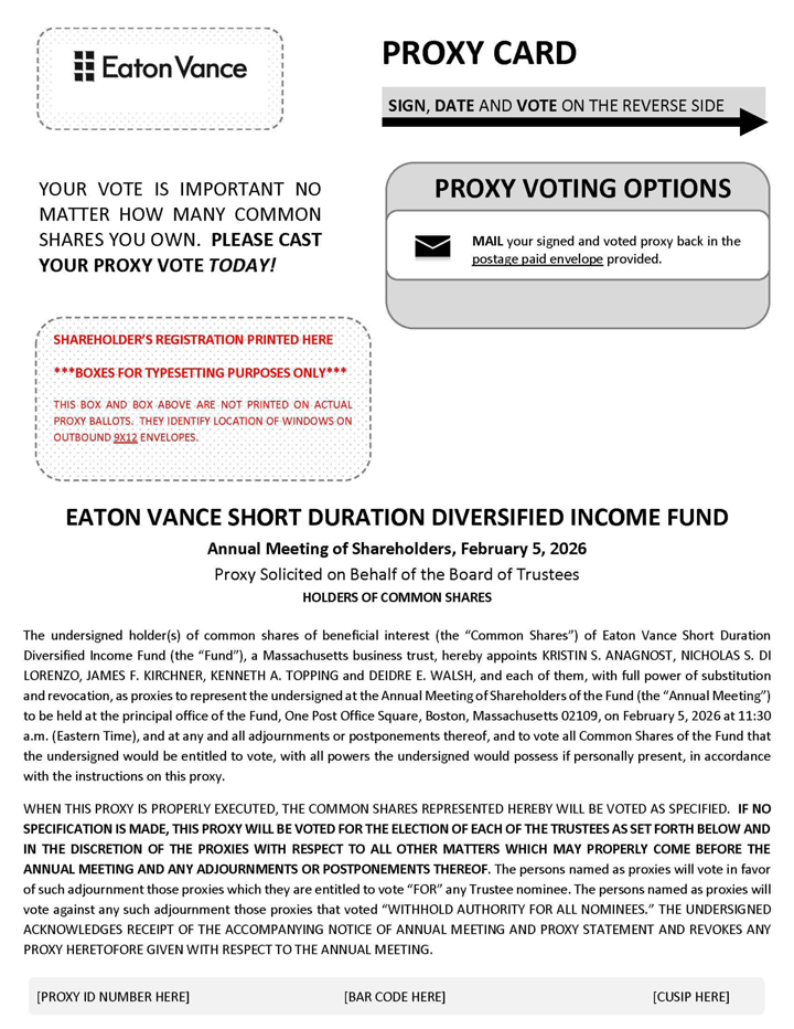 This proxy statement is furnished in connection with the solicitation of proxies by the Board of Trustees of Eaton Vance Short Duration Diversified Income Fund (the “Short Duration Fund”) and Eaton Vance Tax-Advantaged Global Dividend Opportunities Fund (the “Tax-Advantaged Fund”) (each, a “Fund” and together, the “Funds”). The proxies will be voted at the Annual Meeting of Shareholders of each Fund and at any adjournments or postponements thereof (the “Annual Meeting”). The Annual Meeting will be held on Thursday, February 5, 2026 at 11:30 a.m. (Eastern Time) at the principal office of each Fund, One Post Office Square, Boston, Massachusetts 02109, as discussed further herein. The Annual Meeting will be held for the purposes set forth in the accompanying notice. This proxy statement and the enclosed proxy card(s) are first being sent or given to shareholders on or about December 30, 2025.