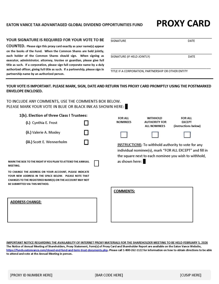 | b. | For Eaton Vance Tax-Advantaged Global Dividend Opportunities Fund, three Class I Trustees, Cynthia E. Frost, Valerie A. Mosley and Scott E. Wennerholm, to be elected by shareholders of the Fund. | ||