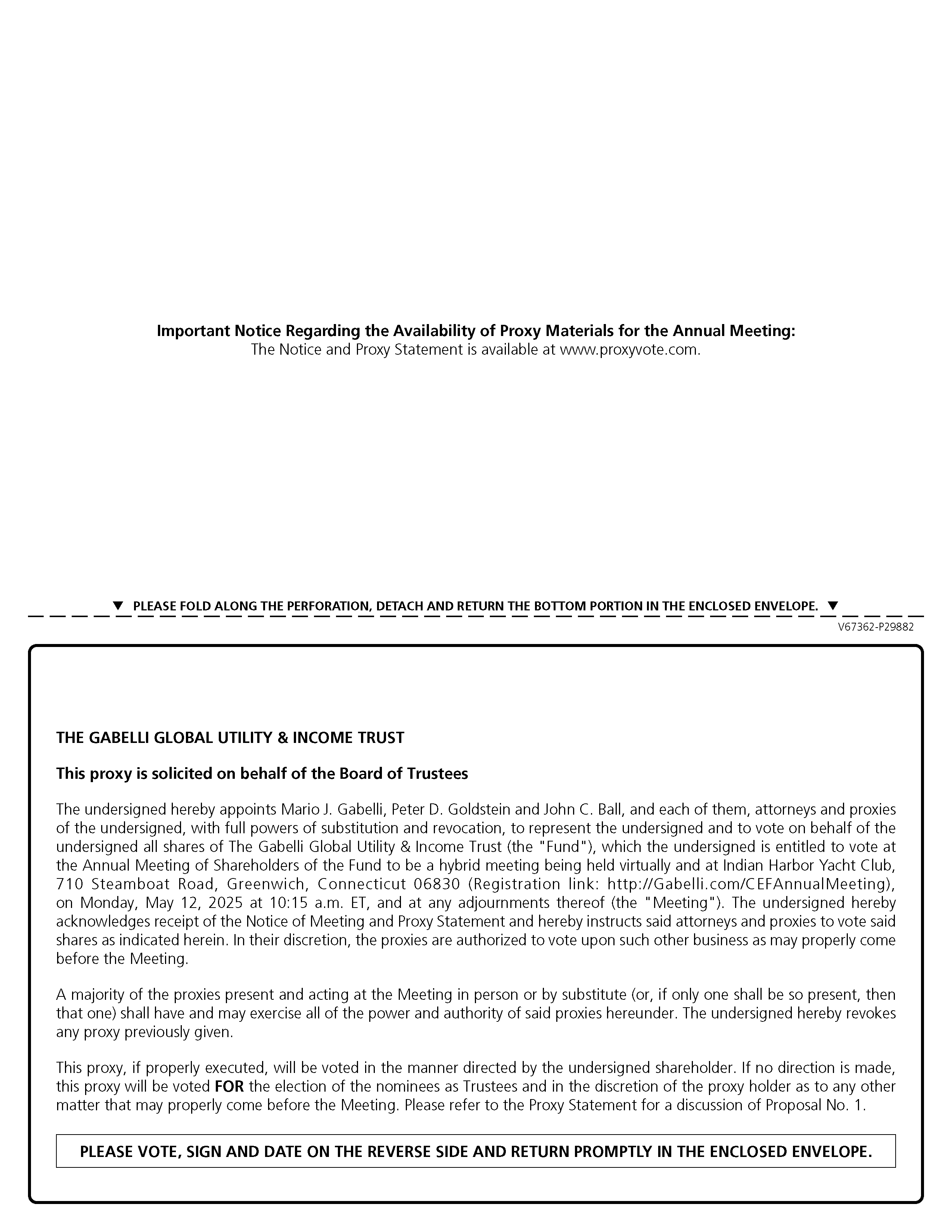 Notice is hereby given that the Annual Meeting of Shareholders of The Gabelli Global Utility & Income Trust, a Delaware statutory trust (the “Fund”), will be held on Monday, May 12, 2025, at 10:15 a.m., ET, at Indian Harbor Yacht Club, 710 Steamboat Road, Greenwich, Connecticut, 06830 and virtually by Internet webcast (the “Meeting”), and at any adjournments or postponements thereof for the following purposes: