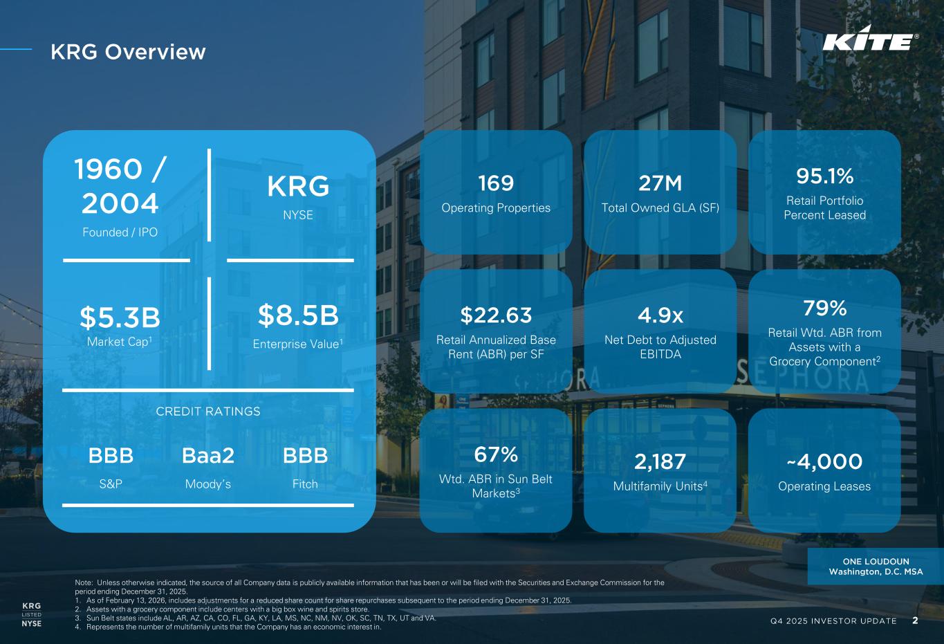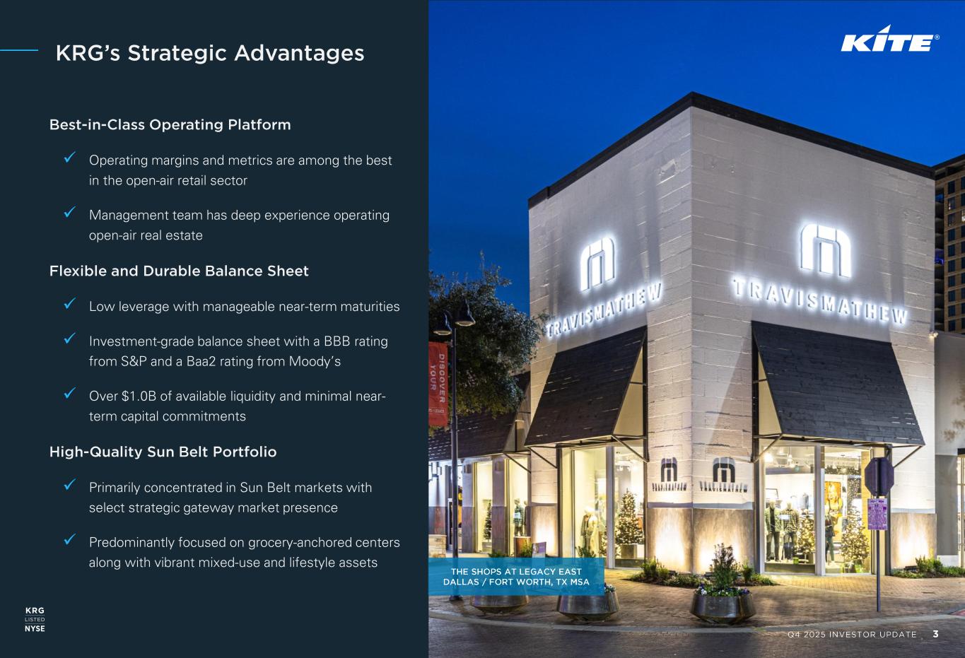 Q4 2025 INVESTOR UPDATE 2 Note: Unless otherwise indicated, the source of all Company data is publicly available information that has been or will be filed with the Securities and Exchange Commission for the period ending December 31, 2025. 1. As of February 13, 2026, includes adjustments for a reduced share count for share repurchases subsequent to the period ending December 31, 2025. 2. Assets with a grocery component include centers with a big box wine and spirits store. 3. Sun Belt states include AL, AR, AZ, CA, CO, FL, GA, KY, LA, MS, NC, NM, NV, OK, SC, TN, TX, UT and VA. 4. Represents the number of multifamily units that the Company has an economic interest in. KRG Overview ONE LOUDOUN Washington, D.C. MSA 169 Operating Properties 27M Total Owned GLA (SF) 95.1% Retail Portfolio Percent Leased $22.63 Retail Annualized Base Rent (ABR) per SF 4.9x Net Debt to Adjusted EBITDA 79% Retail Wtd. ABR from Assets with a Grocery Component2 67% Wtd. ABR in Sun Belt Markets3 2,187 Multifamily Units4 ~4,000 Operating Leases 1960 / 2004 Founded / IPO KRG NYSE $5.3B Market Cap1 $8.5B Enterprise Value1 CREDIT RATINGS BBB Baa2 BBB S&P Moody’s Fitch
