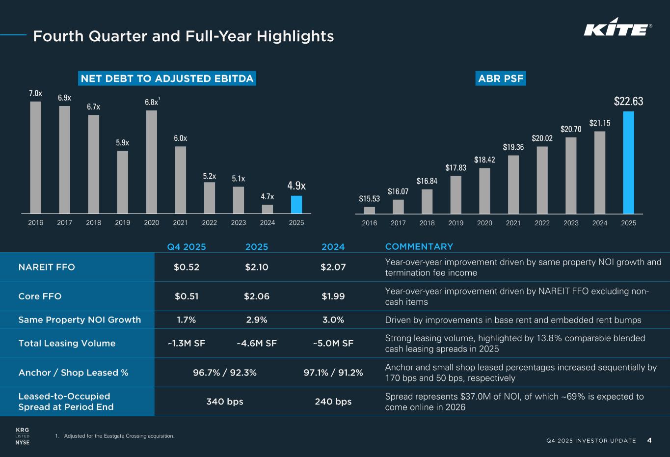 Q4 2025 INVESTOR UPDATE 3 KRG’s Strategic Advantages Best - in -Class Operating Platform ✓ Operating margins and metrics are among the best in the open-air retail sector ✓ Management team has deep experience operating open-air real estate Flexible and Durable Balance Sheet ✓ Low leverage with manageable near-term maturities ✓ Investment-grade balance sheet with a BBB rating from S&P and a Baa2 rating from Moody’s ✓ Over $1.0B of available liquidity and minimal near- term capital commitments High -Quality Sun Belt Portfolio ✓ Primarily concentrated in Sun Belt markets with select strategic gateway market presence ✓ Predominantly focused on grocery-anchored centers along with vibrant mixed-use and lifestyle assets THE SHOPS AT LEGACY EAST DALLAS / FORT WORTH, TX MSA