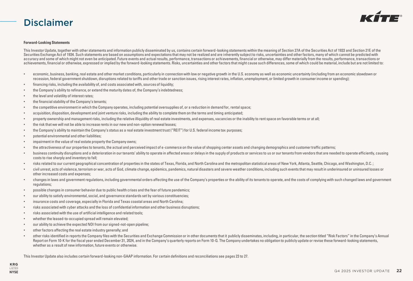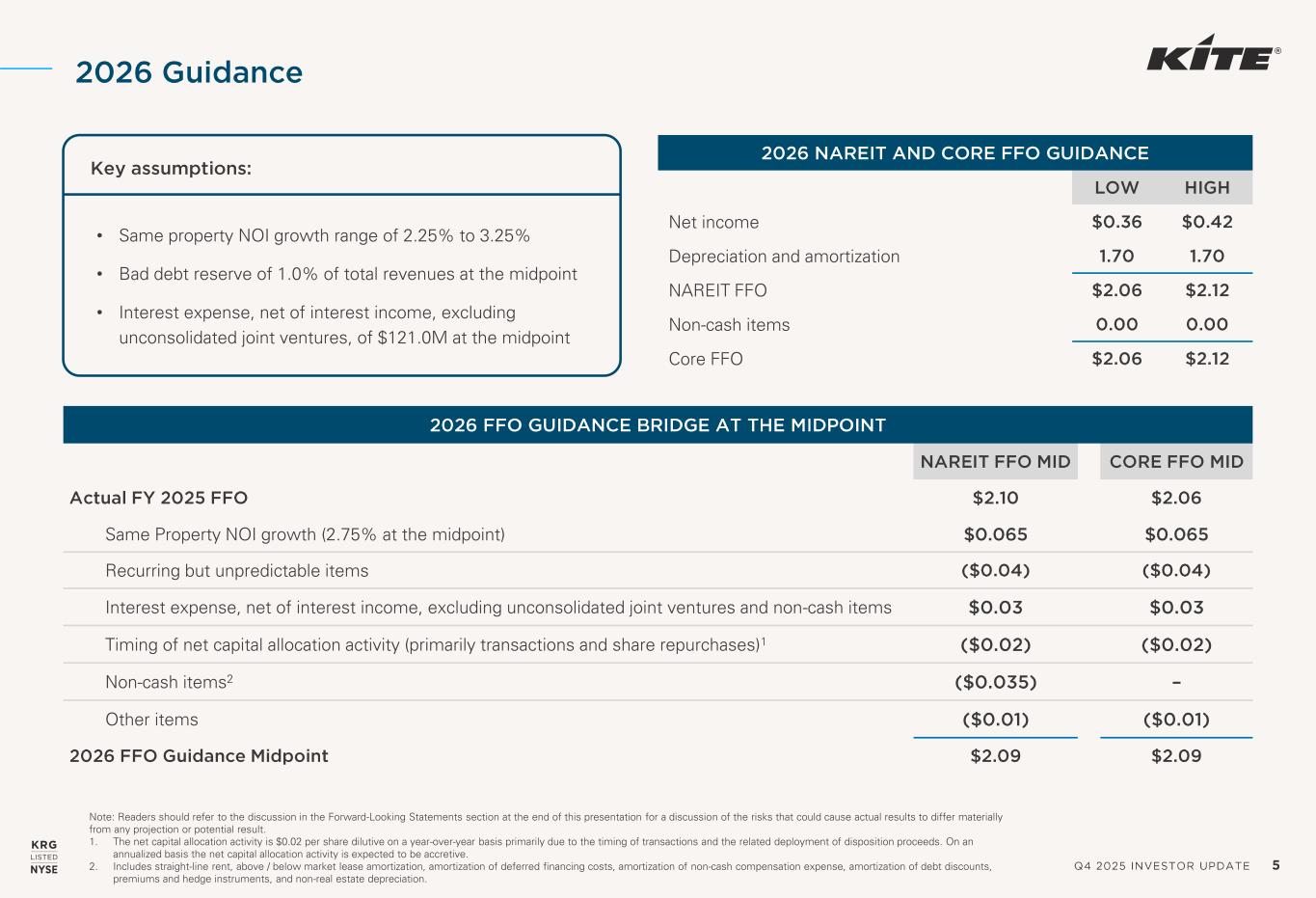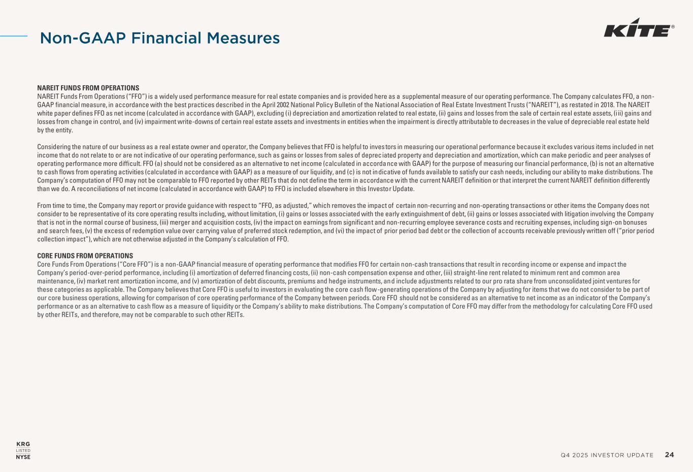 Q4 2025 INVESTOR UPDATE 24 NAREIT FUNDS FROM OPERATIONS NAREIT Funds From Operations (“FFO”) is a widely used performance measure for real estate companies and is provided here as a supplemental measure of our operating performance. The Company calculates FFO, a non- GAAP financial measure, in accordance with the best practices described in the April 2002 National Policy Bulletin of the National Association of Real Estate Investment Trusts (“NAREIT”), as restated in 2018. The NAREIT white paper defines FFO as net income (calculated in accordance with GAAP), excluding (i) depreciation and amortization related to real estate, (ii) gains and losses from the sale of certain real estate assets, (i ii) gains and losses from change in control, and (iv) impairment write-downs of certain real estate assets and investments in entities when the impairment is directly attributable to decreases in the value of depreciable real estate held by the entity. Considering the nature of our business as a real estate owner and operator, the Company believes that FFO is helpful to investors in measuring our operational performance because it excludes various items included in net income that do not relate to or are not indicative of our operating performance, such as gains or losses from sales of depreciated property and depreciation and amortization, which can make periodic and peer analyses of operating performance more difficult. FFO (a) should not be considered as an alternative to net income (calculated in accordance with GAAP) for the purpose of measuring our financial performance, (b) is not an alternative to cash flows from operating activities (calculated in accordance with GAAP) as a measure of our liquidity, and (c) is not indicative of funds available to satisfy our cash needs, including our ability to make distributions. The Company’s computation of FFO may not be comparable to FFO reported by other REITs that do not define the term in accordance w ith the current NAREIT definition or that interpret the current NAREIT definition differently than we do. A reconciliations of net income (calculated in accordance with GAAP) to FFO is included elsewhere in this Investor Update. From time to time, the Company may report or provide guidance with respect to “FFO, as adjusted,” which removes the impact of certain non-recurring and non-operating transactions or other items the Company does not consider to be representative of its core operating results including, without limitation, (i) gains or losses associated with the early extinguishment of debt, (ii) gains or losses associated with litigation involving the Company that is not in the normal course of business, (iii) merger and acquisition costs, (iv) the impact on earnings from significant and non-recurring employee severance costs and recruiting expenses, including sign-on bonuses and search fees, (v) the excess of redemption value over carrying value of preferred stock redemption, and (vi) the impact of prior period bad debt or the collection of accounts receivable previously written off (“prior period collection impact”), which are not otherwise adjusted in the Company’s calculation of FFO. CORE FUNDS FROM OPERATIONS Core Funds From Operations (“Core FFO”) is a non-GAAP financial measure of operating performance that modifies FFO for certain non-cash transactions that result in recording income or expense and impact the Company’s period-over-period performance, including (i) amortization of deferred financing costs, (ii) non-cash compensation expense and other, (iii) straight-line rent related to minimum rent and common area maintenance, (iv) market rent amortization income, and (v) amortization of debt discounts, premiums and hedge instruments, and include adjustments related to our pro rata share from unconsolidated joint ventures for these categories as applicable. The Company believes that Core FFO is useful to investors in evaluating the core cash flow-generating operations of the Company by adjusting for items that we do not consider to be part of our core business operations, allowing for comparison of core operating performance of the Company between periods. Core FFO should not be considered as an alternative to net income as an indicator of the Company’s performance or as an alternative to cash flow as a measure of liquidity or the Company’s ability to make distributions. The Company’s computation of Core FFO may differ from the methodology for calculating Core FFO used by other REITs, and therefore, may not be comparable to such other REITs. Non -GAAP Financial Measures