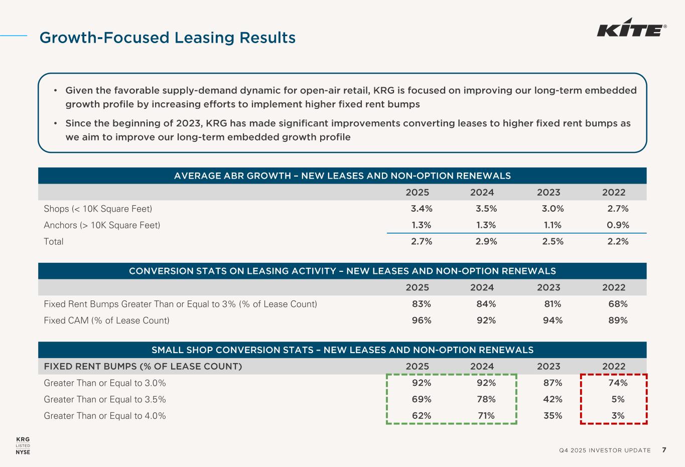 Q4 2025 INVESTOR UPDATE 6 Note: Remaining percentage of KRG’s portfolio is unanchored, standalone office, or single-tenant assets. Diverse Portfolio of Durable Cash Flow Lifestyle / Mixed -UsePower Centers Regional Community Centers (≥ 200,000 Owned GLA) Neighborhood Centers & Local Community Centers (< 200,000 Owned GLA) % of Wtd . ABR – Q4’25 39% 19% 14% 27% % of Wtd . ABR – Q4’22 36% 21% 19% 22% Change in % of Wtd . ABR +300 bps (200 bps) (500 bps) +500 bps % of Total Owned GLA 39% 22% 19% 18% Embedded Rent Bumps 183 bps 155 bps 153 bps 210 bps Retail ABR psf $22.14 $18.99 $16.57 $40.78