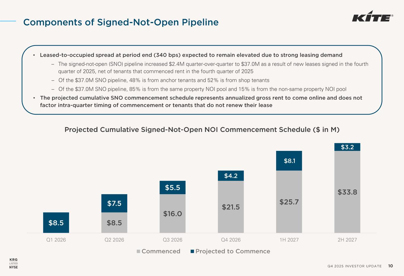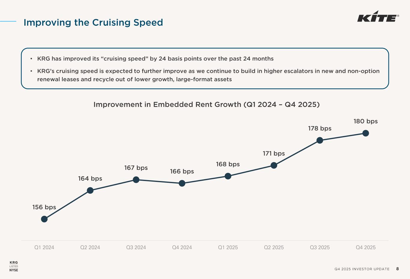 Q4 2025 INVESTOR UPDATE 7 Growth -Focused Leasing Results • Given the favorable supply -demand dynamic for open -air retail, KRG is focused on improving our long -term embedded growth profile by increasing efforts to implement higher fixed rent bumps • Since the beginning of 2023, KRG has made significant improvements converting leases to higher fixed rent bumps as we aim to improve our long -term embedded growth profile AVERAGE ABR GROWTH – NEW LEASES AND NON -OPTION RENEWALS 2025 2024 2023 2022 Shops (< 10K Square Feet) 3.4% 3.5% 3.0% 2.7% Anchors (> 10K Square Feet) 1.3% 1.3% 1.1% 0.9% Total 2.7% 2.9% 2.5% 2.2% CONVERSION STATS ON LEASING ACTIVITY – NEW LEASES AND NON -OPTION RENEWALS 2025 2024 2023 2022 Fixed Rent Bumps Greater Than or Equal to 3% (% of Lease Count) 83% 84% 81% 68% Fixed CAM (% of Lease Count) 96% 92% 94% 89% SMALL SHOP CONVERSION STATS – NEW LEASES AND NON -OPTION RENEWALS FIXED RENT BUMPS (% OF LEASE COUNT) 2025 2024 2023 2022 Greater Than or Equal to 3.0% 92% 92% 87% 74% Greater Than or Equal to 3.5% 69% 78% 42% 5% Greater Than or Equal to 4.0% 62% 71% 35% 3%