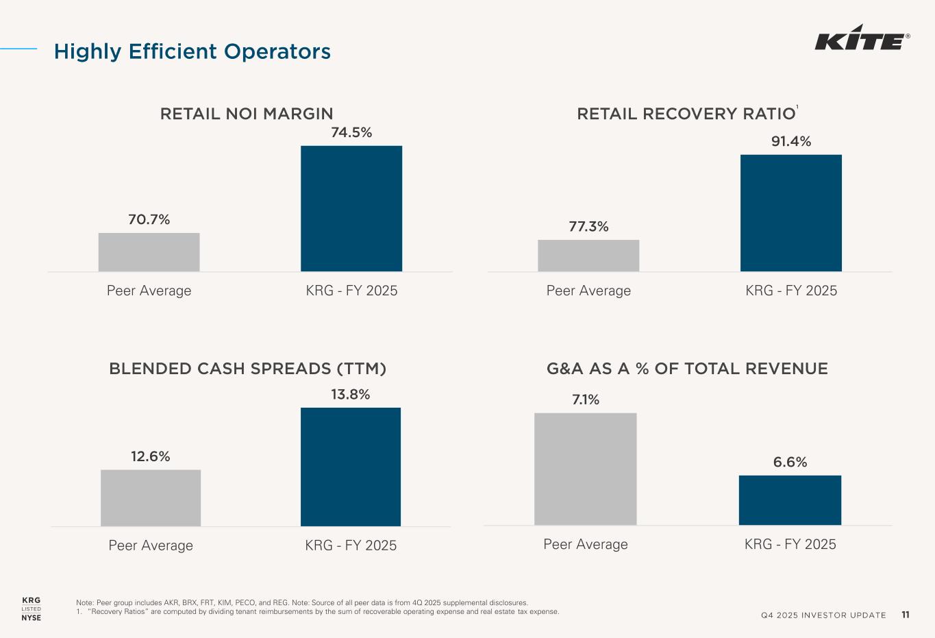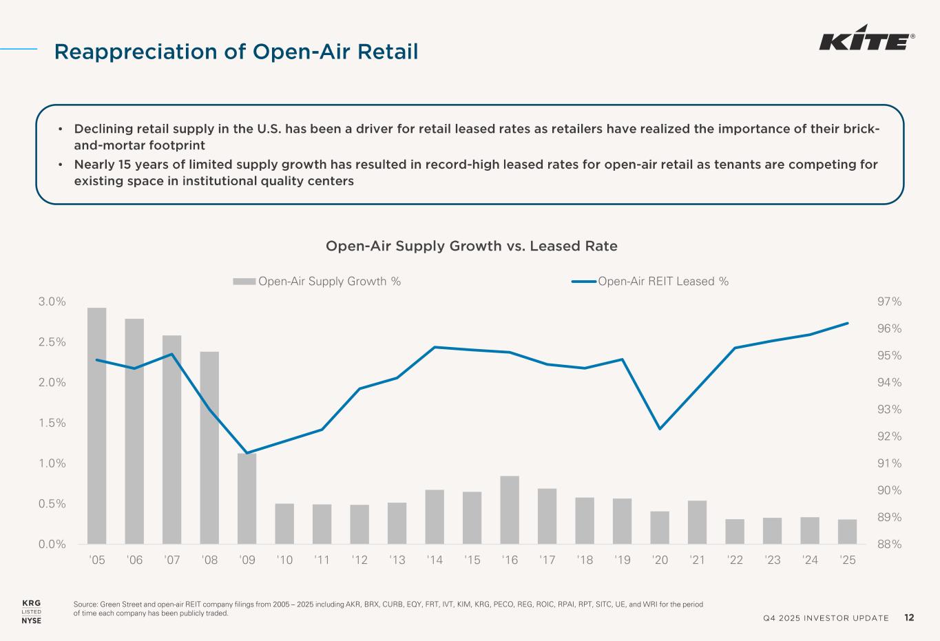 Q4 2025 INVESTOR UPDATE 11 70.7% 74.5% Peer Average KRG - FY 2025 RETAIL NOI MARGIN Note: Peer group includes AKR, BRX, FRT, KIM, PECO, and REG. Note: Source of all peer data is from 4Q 2025 supplemental disclosures. 1. “Recovery Ratios” are computed by dividing tenant reimbursements by the sum of recoverable operating expense and real estate tax expense. Highly Efficient Operators 77.3% 91.4% Peer Average KRG - FY 2025 RETAIL RECOVERY RATIO 12.6% 13.8% Peer Average KRG - FY 2025 BLENDED CASH SPREADS (TTM) 7.1% 6.6% Peer Average KRG - FY 2025 G&A AS A % OF TOTAL REVENUE 1