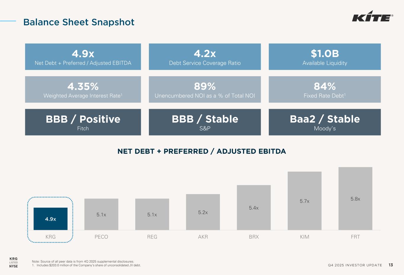 Q4 2025 INVESTOR UPDATE 13 Note: Source of all peer data is from 4Q 2025 supplemental disclosures. 1. Includes $203.0 million of the Company’s share of unconsolidated JV debt. Balance Sheet Snapshot 4.9x Net Debt + Preferred / Adjusted EBITDA 4.2x Debt Service Coverage Ratio $1.0B Available Liquidity 4.35% Weighted Average Interest Rate1 89% Unencumbered NOI as a % of Total NOI 84% Fixed Rate Debt1 BBB / Positive Fitch BBB / Stable S&P Baa2 / Stable Moody’s 4.9x 5.1x 5.1x 5.2x 5.4x 5.7x 5.8x KRG PECO REG AKR BRX KIM FRT NET DEBT + PREFERRED / ADJUSTED EBITDA