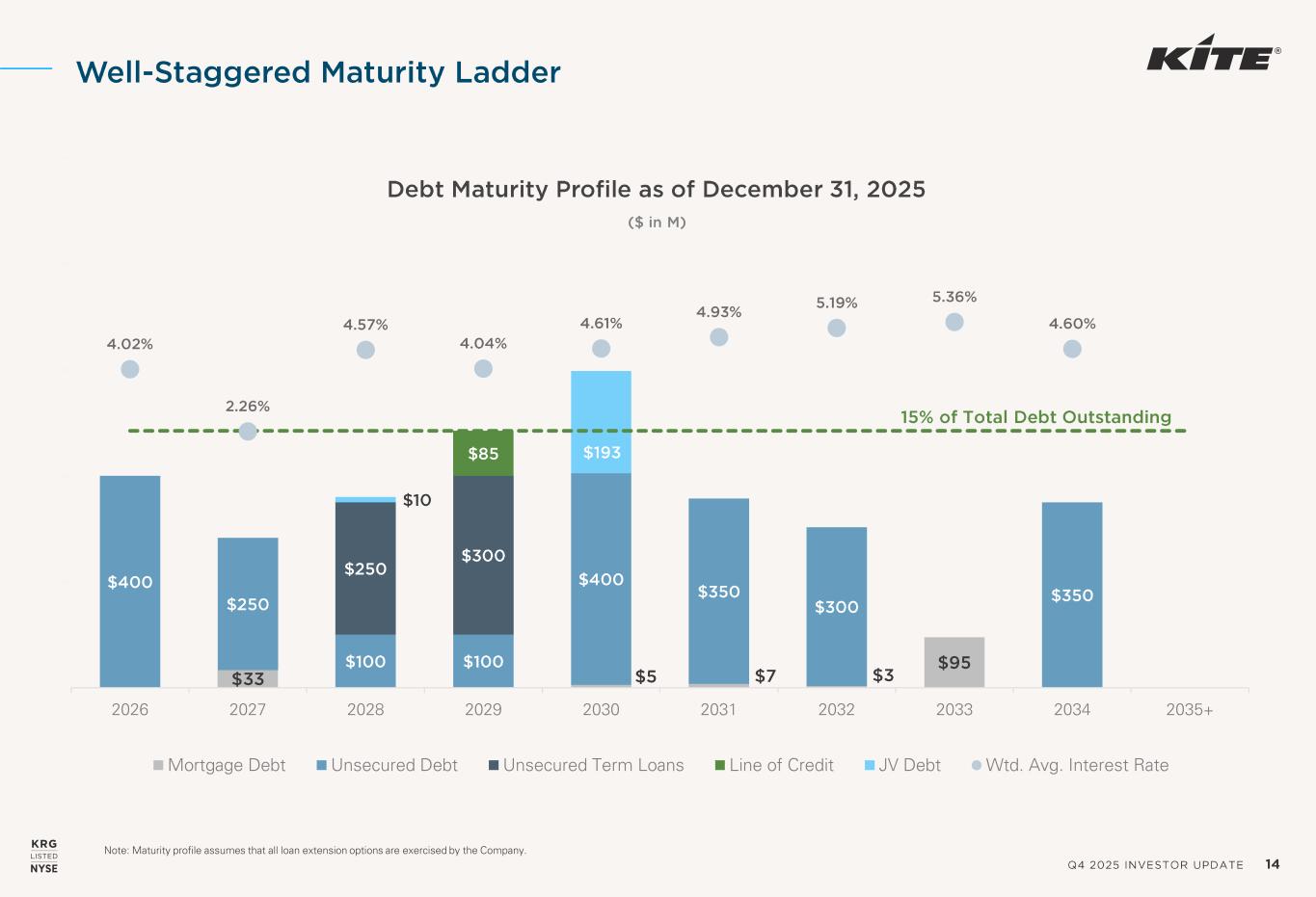 Q4 2025 INVESTOR UPDATE 14 Well -Staggered Maturity Ladder $33 $5 $7 $3 $95 $400 $250 $100 $100 $400 $350 $300 $350 $250 $300 $85 $10 $193 4.02% 2.26% 4.57% 4.04% 4.61% 4.93% 5.19% 5.36% 4.60% -5% -3% -1% 1% 3% 5% 7% 9% $- $200 $400 $600 $800 $1,000 2026 2027 2028 2029 2030 2031 2032 2033 2034 2035+ Debt Maturity Profile as of December 31, 2025 Mortgage Debt Unsecured Debt Unsecured Term Loans Line of Credit JV Debt Wtd. Avg. Interest Rate 15% of Total Debt Outstanding ($ in M) Note: Maturity profile assumes that all loan extension options are exercised by the Company.