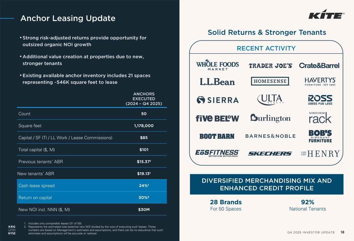 Q4 2025 INVESTOR UPDATE 17 Portfolio Needle -Movers 1. Represents weighted average from the three properties compared to KRG’s portfolio average of 180 basis points as of December 31, 2025. 2. Includes residential units and hotel rooms currently contemplated in development plans as previously disclosed. KEY METRICS SOUTHLAKE TOWN SQUARE ONE LOUDOUN LEGACY WEST TOTAL % of Q4 2025 Annualized Portfolio NOI 6.4% 4.2% 4.1% 14.7% % of Total Retail Square Footage 2.6% 1.3% 1.4% 5.3% % of Total Office Square Footage 12.0% 9.9% 22.6% 44.5% Small Shop Retail ABR psf $54.40 $47.21 $75.72 $58.82 Retail ABR psf $45.27 $38.39 $68.19 $49.55 Embedded Rent Escalators 240 210 250 240 1 Number of Visitors in 2025 8.0M 4.7M 5.0M 17.7M Retail and Office Tenant Count 181 96 92 369 Residential Units (On Site)2 110 1,304 782 2,196 Hotel Rooms (On Site)2 248 295 304 847 Legacy West – Dallas / Fort Worth, TX MSA One Loudoun – Washington, D.C. MSA Southlake Town Square – Dallas / Fort Worth, TX MSA