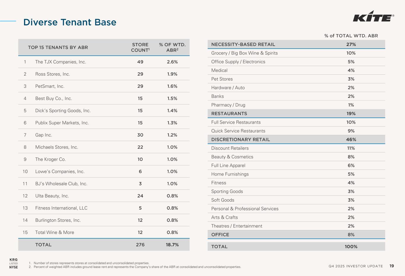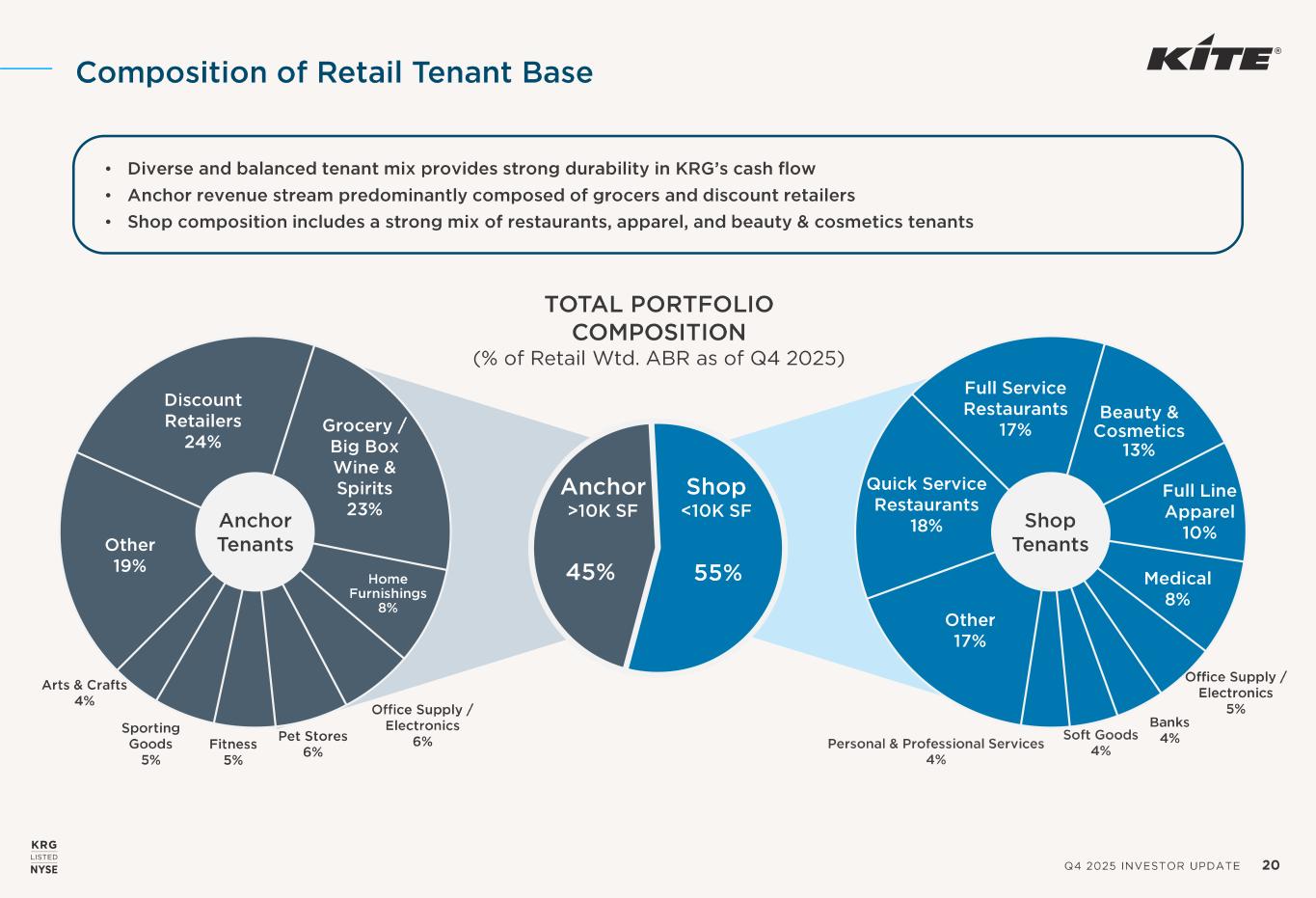 Q4 2025 INVESTOR UPDATE 19 1. Number of stores represents stores at consolidated and unconsolidated properties. 2. Percent of weighted ABR includes ground lease rent and represents the Company’s share of the ABR at consolidated and unconsolidated properties. TOP 15 TENANTS BY ABR STORE COUNT 1 % OF WTD. ABR 2 1 The TJX Companies, Inc. 49 2.6% 2 Ross Stores, Inc. 29 1.9% 3 PetSmart, Inc. 29 1.6% 4 Best Buy Co., Inc. 15 1.5% 5 Dick’s Sporting Goods, Inc. 15 1.4% 6 Publix Super Markets, Inc. 15 1.3% 7 Gap Inc. 30 1.2% 8 Michaels Stores, Inc. 22 1.0% 9 The Kroger Co. 10 1.0% 10 Lowe’s Companies, Inc. 6 1.0% 11 BJ’s Wholesale Club, Inc. 3 1.0% 12 Ulta Beauty, Inc. 24 0.8% 13 Fitness International, LLC 5 0.8% 14 Burlington Stores, Inc. 12 0.8% 15 Total Wine & More 12 0.8% TOTAL 276 18.7% % of TOTAL WTD. ABR NECESSITY -BASED RETAIL 27% Grocery / Big Box Wine & Spirits 10% Office Supply / Electronics 5% Medical 4% Pet Stores 3% Hardware / Auto 2% Banks 2% Pharmacy / Drug 1% RESTAURANTS 19% Full Service Restaurants 10% Quick Service Restaurants 9% DISCRETIONARY RETAIL 46% Discount Retailers 11% Beauty & Cosmetics 8% Full Line Apparel 6% Home Furnishings 5% Fitness 4% Sporting Goods 3% Soft Goods 3% Personal & Professional Services 2% Arts & Crafts 2% Theatres / Entertainment 2% OFFICE 8% TOTAL 100% Diverse Tenant Base