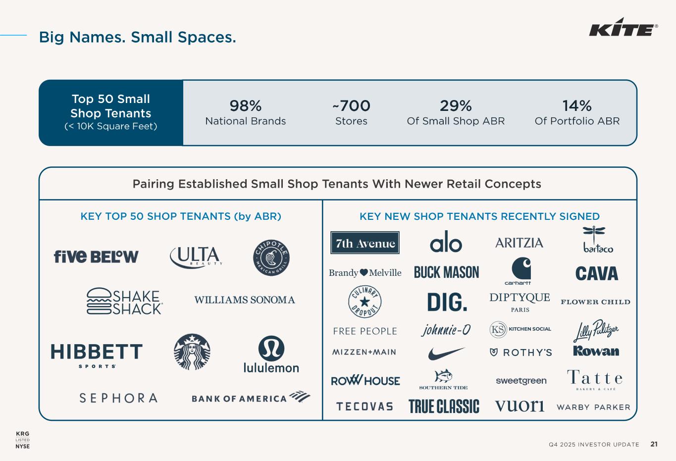 Q4 2025 INVESTOR UPDATE 21 Big Names. Small Spaces. KEY NEW SHOP TENANTS RECENTLY SIGNEDKEY TOP 50 SHOP TENANTS (by ABR) Pairing Established Small Shop Tenants With Newer Retail Concepts 98% National Brands ~700 Stores 29% Of Small Shop ABR 14% Of Portfolio ABR Top 50 Small Shop Tenants (< 10K Square Feet)