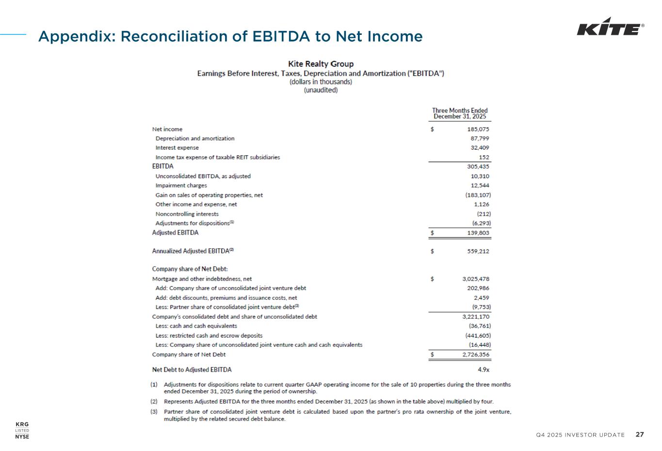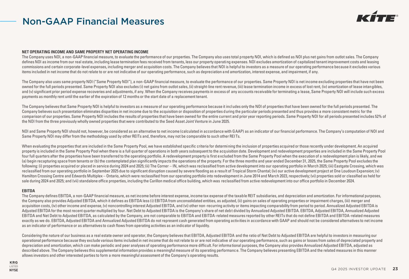 Q4 2025 INVESTOR UPDATE 23 NET OPERATING INCOME AND SAME PROPERTY NET OPERATING INCOME The Company uses NOI, a non-GAAP financial measure, to evaluate the performance of our properties. The Company also uses total property NOI, which is defined as NOI plus net gains from outlot sales. The Company defines NOI as income from our real estate, including lease termination fees received from tenants, less our property operating expenses. NOI excludes amortization of capitalized tenant improvement costs and leasing commissions and certain corporate-level expenses, including merger and acquisition costs. The Company believes that NOI is helpful to investors as a measure of our operating performance because it excludes various items included in net income that do not relate to or are not indicative of our operating performance, such as depreciation and amortization, interest expense, and impairment, if any. The Company also uses same property NOI (“Same Property NOI”), a non-GAAP financial measure, to evaluate the performance of our properties. Same Property NOI is net income excluding properties that have not been owned for the full periods presented. Same Property NOI also excludes (i) net gains from outlot sales, (ii) straight-line rent revenue, (iii) lease termination income in excess of lost rent, (iv) amortization of lease intangibles, and (v) significant prior period expense recoveries and adjustments, if any. When the Company receives payments in excess of any accounts receivable for terminating a lease, Same Property NOI will include such excess payments as monthly rent until the earlier of the expiration of 12 months or the start date of a replacement tenant. The Company believes that Same Property NOI is helpful to investors as a measure of our operating performance because it includes only the NOI of properties that have been owned for the full periods presented. The Company believes such presentation eliminates disparities in net income due to the acquisition or disposition of properties during the particular periods presented and thus provides a more consistent metric for the comparison of our properties. Same Property NOI includes the results of properties that have been owned for the entire current and prior year reporting periods. Same Property NOI for all periods presented includes 52% of the NOI from the three previously wholly owned properties that were contributed to the Seed Asset Joint Venture in June 2025. NOI and Same Property NOI should not, however, be considered as an alternative to net income (calculated in accordance with GAAP) as an indicator of our financial performance. The Company’s computation of NOI and Same Property NOI may differ from the methodology used by other REITs and, therefore, may not be comparable to such other REITs. When evaluating the properties that are included in the Same Property Pool, we have established specific criteria for determining the inclusion of properties acquired or those recently under development. An acquired property is included in the Same Property Pool when there is a full quarter of operations in both years subsequent to the acquisition date. Development and redevelopment properties are included in the Same Property Pool four full quarters after the properties have been transferred to the operating portfolio. A redevelopment property is first excluded from the Same Property Pool when the execution of a redevelopment plan is likely, and we (a) begin recapturing space from tenants or (b) the contemplated plan significantly impacts the operations of the property. For the three months and year ended December 31, 2025, the Same Property Pool excludes the following: (i) properties acquired or placed in service during 2024 and 2025; (ii) The Corner – IN, which was reclassified from active development into our operating portfolio in March 2025; (iii) Eastgate Crossing, which was reclassified from our operating portfolio in September 2025 due to significant disruption caused by severe flooding as a result of Tropical Storm Chantal; (iv) our active development project at One Loudoun Expansion; (v) Hamilton Crossing Centre and Edwards Multiplex – Ontario, which were reclassified from our operating portfolio into redevelopment in June 2014 and March 2023, respectively; (vi) properties sold or classified as held for sale during 2024 and 2025; and (vii) standalone office properties, including the Carillon medical office building, which was reclassified from active redevelopment into our office portfolio in December 2024. EBITDA The Company defines EBITDA, a non-GAAP financial measure, as net income before interest expense, income tax expense of the taxable REIT subsidiaries, and depreciation and amortization. For informational purposes, the Company also provides Adjusted EBITDA, which it defines as EBITDA less (i) EBITDA from unconsolidated entities, as adjusted, (ii) gains on sales of operating properties or impairment charges, (iii) merger and acquisition costs, (iv) other income and expense, (v) noncontrolling interest Adjusted EBITDA, and (vi) other non-recurring activity or items impacting comparability from period to period. Annualized Adjusted EBITDA is Adjusted EBITDA for the most recent quarter multiplied by four. Net Debt to Adjusted EBITDA is the Company’s share of net deb t divided by Annualized Adjusted EBITDA. EBITDA, Adjusted EBITDA, Annualized Adjusted EBITDA and Net Debt to Adjusted EBITDA, as calculated by the Company, are not comparable to EBITDA and EBITDA-related measures reported by other REITs that do not define EBITDA and EBITDA-related measures exactly as we do. EBITDA, Adjusted EBITDA and Annualized Adjusted EBITDA do not represent cash generated from operating activ ities in accordance with GAAP and should not be considered alternatives to net income as an indicator of performance or as alternatives to cash flows from operating activities as an indicator of liquidity. Considering the nature of our bu