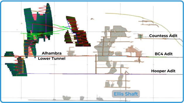 Figure 3: Long section view of Crescent Silver Mine with key adits, shaft and tunnels