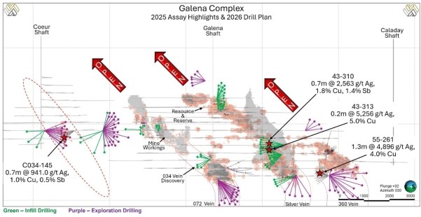 Figure 1: (L) Long section view of the Galena Complex showing select high-grade vein discoveries (red stars) and Americas 2026 underground infill (green trace) and exploration (purple trace) drill programs