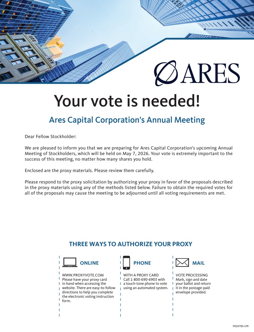 | Dear Fellow Stockholder: We are pleased to inform you that we are preparing for Ares Capital Corporation's upcoming Annual Meeting of Stockholders, which will be held on May 7, 2026. Your vote is extremely important to the success of this meeting, no matter how many shares you hold. Enclosed are the proxy materials. Please review them carefully. Please respond to the proxy solicitation by authorizing your proxy in favor of the proposals described in the proxy materials using any of the methods listed below. Failure to obtain the required votes for all of the proposals may cause the meeting to be adjourned until all voting requirements are met. P024765-LTR WITH A PROXY CARD Call 1-800-690-6903 with a touch-tone phone to vote using an automated system. PHONE WWW.PROXYVOTE.COM Please have your proxy card in hand when accessing the website. There are easy-to-follow directions to help you complete the electronic voting instruction form. ONLINE VOTE PROCESSING Mark, sign and date your ballot and return it in the postage-paid envelope provided. MAIL THREE WAYS TO AUTHORIZE YOUR PROXY Your vote is needed! Ares Capital Corporation's Annual Meeting |