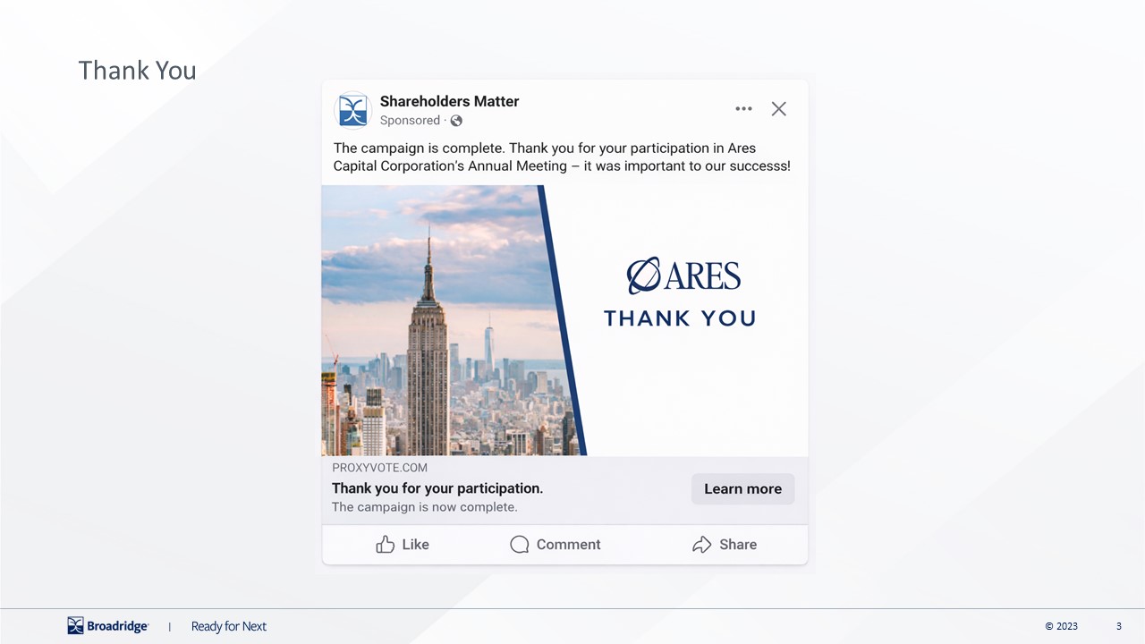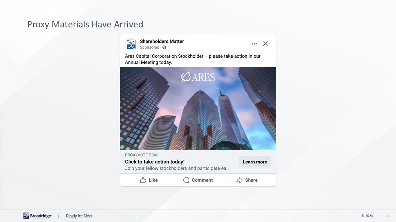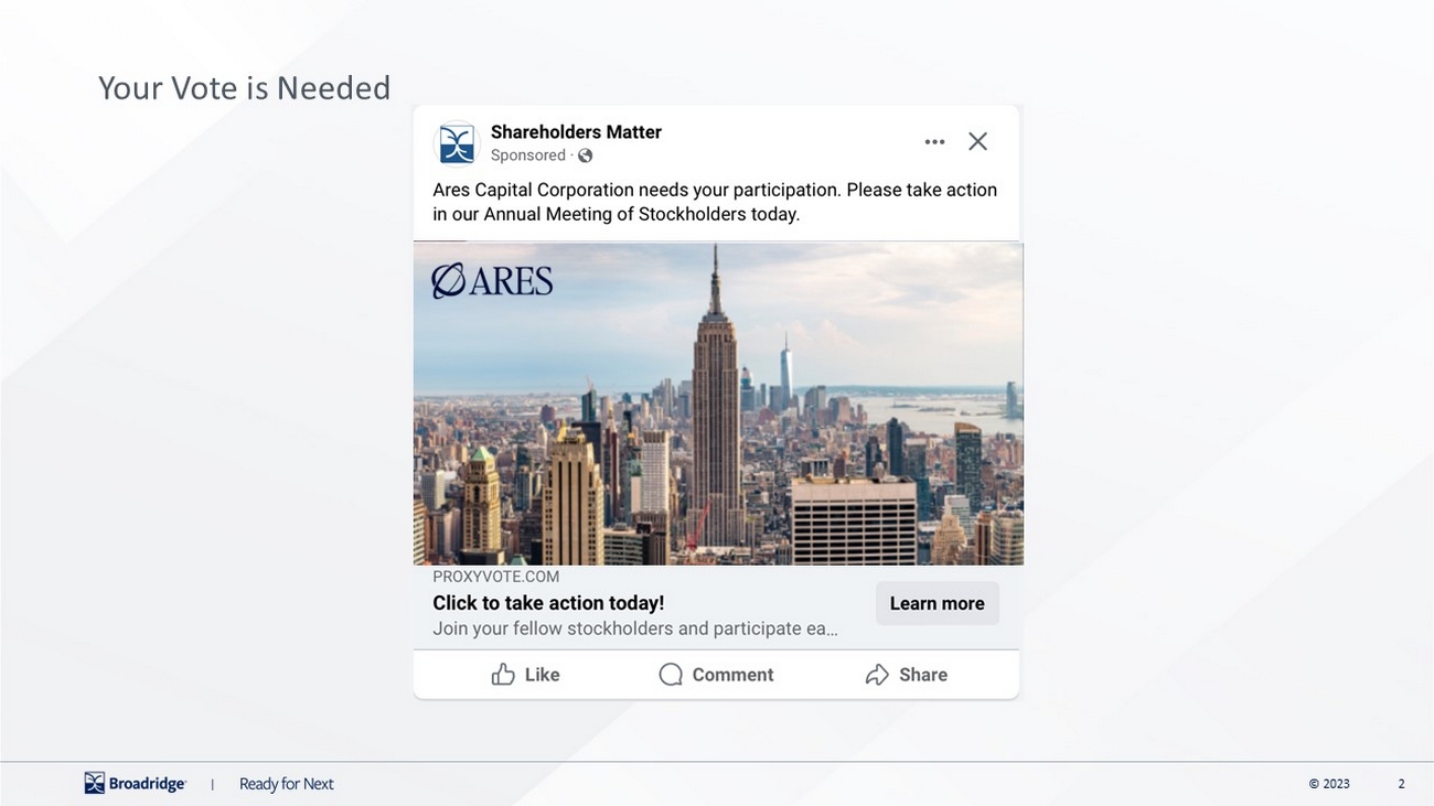| Your vote is important! Vote your shares today! The Annual Meeting of Stockholders will be held on May 7, 2026. Whether or not you plan to attend, your vote is very important. You can authorize a proxy to vote your shares by internet, telephone, or mail. Simply follow the instructions on the enclosed form. For your convenience, we’ve highlighted where you can find your unique Control Number. WITH A PROXY CARD Call 1-800-690-6903 with a touch-tone phone to vote using an automated system. PHONE WWW.PROXYVOTE.COM Please have your proxy card in hand when accessing the website. There are easy-to-follow directions to help you complete the electronic voting instruction form. ONLINE VOTE PROCESSING Mark, sign and date your ballot and return it in the postage-paid envelope provided. MAIL THREE WAYS TO AUTHORIZE YOUR PROXY 0000 0000 0000 0000 0000 0000 0000 0000 0000 0000 0000 0000 0000 0000 0000 0000 NOTE: This is not an actual Control Number. Please refer to the voting instruction form for your unique Control Number. NOTE: This is not an actual Control Number. Please refer to the proxy card for your unique Control Number. ARES CAPITAL CORPORATION |