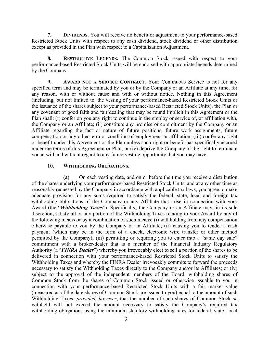 3. 7. DIVIDENDS. You will receive no benefit or adjustment to your performance-based Restricted Stock Units with respect to any cash dividend, stock dividend or other distribution except as provided in the Plan with respect to a Capitalization Adjustment. 8. RESTRICTIVE LEGENDS. The Common Stock issued with respect to your performance-based Restricted Stock Units will be endorsed with appropriate legends determined by the Company. 9. AWARD NOT A SERVICE CONTRACT. Your Continuous Service is not for any specified term and may be terminated by you or by the Company or an Affiliate at any time, for any reason, with or without cause and with or without notice. Nothing in this Agreement (including, but not limited to, the vesting of your performance-based Restricted Stock Units or the issuance of the shares subject to your performance-based Restricted Stock Units), the Plan or any covenant of good faith and fair dealing that may be found implicit in this Agreement or the Plan shall: (i) confer on you any right to continue in the employ or service of, or affiliation with, the Company or an Affiliate; (ii) constitute any promise or commitment by the Company or an Affiliate regarding the fact or nature of future positions, future work assignments, future compensation or any other term or condition of employment or affiliation; (iii) confer any right or benefit under this Agreement or the Plan unless such right or benefit has specifically accrued under the terms of this Agreement or Plan; or (iv) deprive the Company of the right to terminate you at will and without regard to any future vesting opportunity that you may have. 10. WITHHOLDING OBLIGATIONS. (a) On each vesting date, and on or before the time you receive a distribution of the shares underlying your performance-based Restricted Stock Units, and at any other time as reasonably requested by the Company in accordance with applicable tax laws, you agree to make adequate provision for any sums required to satisfy the federal, state, local and foreign tax withholding obligations of the Company or any Affiliate that arise in connection with your Award (the “Withholding Taxes”). Specifically, the Company or an Affiliate may, in its sole discretion, satisfy all or any portion of the Withholding Taxes relating to your Award by any of the following means or by a combination of such means: (i) withholding from any compensation otherwise payable to you by the Company or an Affiliate; (ii) causing you to tender a cash payment (which may be in the form of a check, electronic wire transfer or other method permitted by the Company); (iii) permitting or requiring you to enter into a “same day sale” commitment with a broker-dealer that is a member of the Financial Industry Regulatory Authority (a “FINRA Dealer”) whereby you irrevocably elect to sell a portion of the shares to be delivered in connection with your performance-based Restricted Stock Units to satisfy the Withholding Taxes and whereby the FINRA Dealer irrevocably commits to forward the proceeds necessary to satisfy the Withholding Taxes directly to the Company and/or its Affiliates; or (iv) subject to the approval of the independent members of the Board, withholding shares of Common Stock from the shares of Common Stock issued or otherwise issuable to you in connection with your performance-based Restricted Stock Units with a fair market value (measured as of the date shares of Common Stock are issued to you) equal to the amount of such Withholding Taxes; provided, however, that the number of such shares of Common Stock so withheld will not exceed the amount necessary to satisfy the Company’s required tax withholding obligations using the minimum statutory withholding rates for federal, state, local