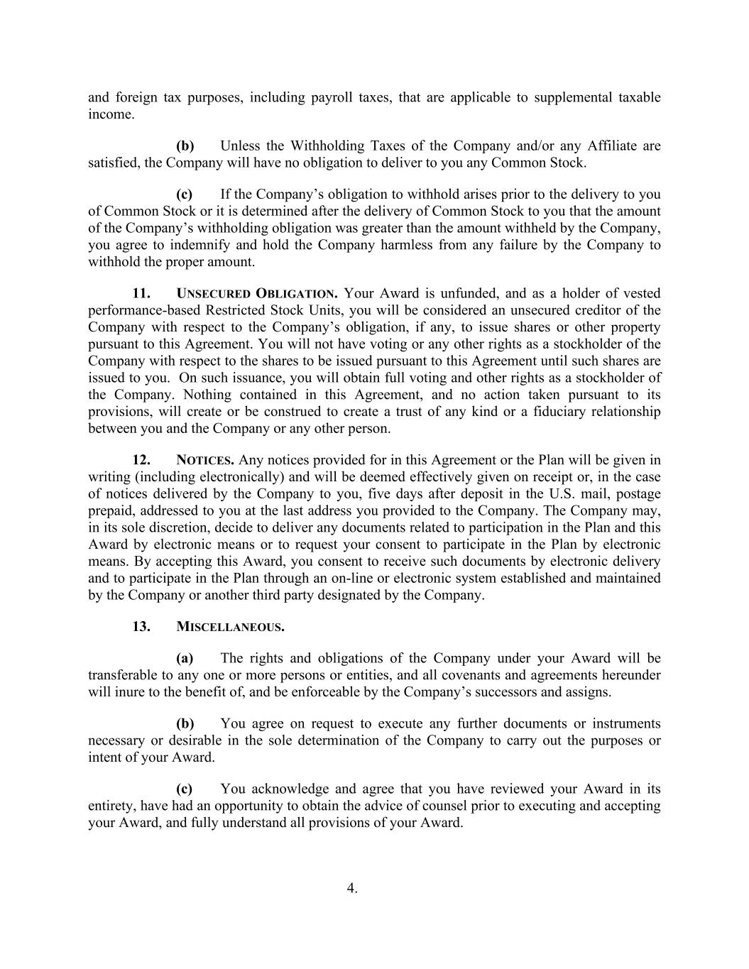 4. and foreign tax purposes, including payroll taxes, that are applicable to supplemental taxable income. (b) Unless the Withholding Taxes of the Company and/or any Affiliate are satisfied, the Company will have no obligation to deliver to you any Common Stock. (c) If the Company’s obligation to withhold arises prior to the delivery to you of Common Stock or it is determined after the delivery of Common Stock to you that the amount of the Company’s withholding obligation was greater than the amount withheld by the Company, you agree to indemnify and hold the Company harmless from any failure by the Company to withhold the proper amount. 11. UNSECURED OBLIGATION. Your Award is unfunded, and as a holder of vested performance-based Restricted Stock Units, you will be considered an unsecured creditor of the Company with respect to the Company’s obligation, if any, to issue shares or other property pursuant to this Agreement. You will not have voting or any other rights as a stockholder of the Company with respect to the shares to be issued pursuant to this Agreement until such shares are issued to you. On such issuance, you will obtain full voting and other rights as a stockholder of the Company. Nothing contained in this Agreement, and no action taken pursuant to its provisions, will create or be construed to create a trust of any kind or a fiduciary relationship between you and the Company or any other person. 12. NOTICES. Any notices provided for in this Agreement or the Plan will be given in writing (including electronically) and will be deemed effectively given on receipt or, in the case of notices delivered by the Company to you, five days after deposit in the U.S. mail, postage prepaid, addressed to you at the last address you provided to the Company. The Company may, in its sole discretion, decide to deliver any documents related to participation in the Plan and this Award by electronic means or to request your consent to participate in the Plan by electronic means. By accepting this Award, you consent to receive such documents by electronic delivery and to participate in the Plan through an on-line or electronic system established and maintained by the Company or another third party designated by the Company. 13. MISCELLANEOUS. (a) The rights and obligations of the Company under your Award will be transferable to any one or more persons or entities, and all covenants and agreements hereunder will inure to the benefit of, and be enforceable by the Company’s successors and assigns. (b) You agree on request to execute any further documents or instruments necessary or desirable in the sole determination of the Company to carry out the purposes or intent of your Award. (c) You acknowledge and agree that you have reviewed your Award in its entirety, have had an opportunity to obtain the advice of counsel prior to executing and accepting your Award, and fully understand all provisions of your Award.